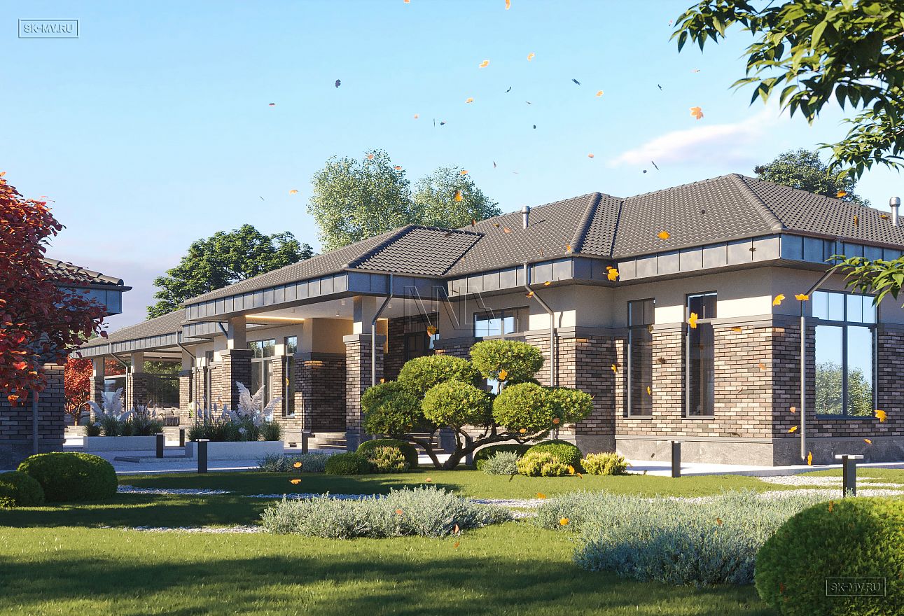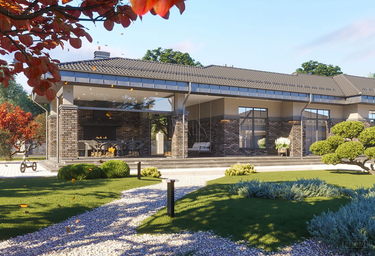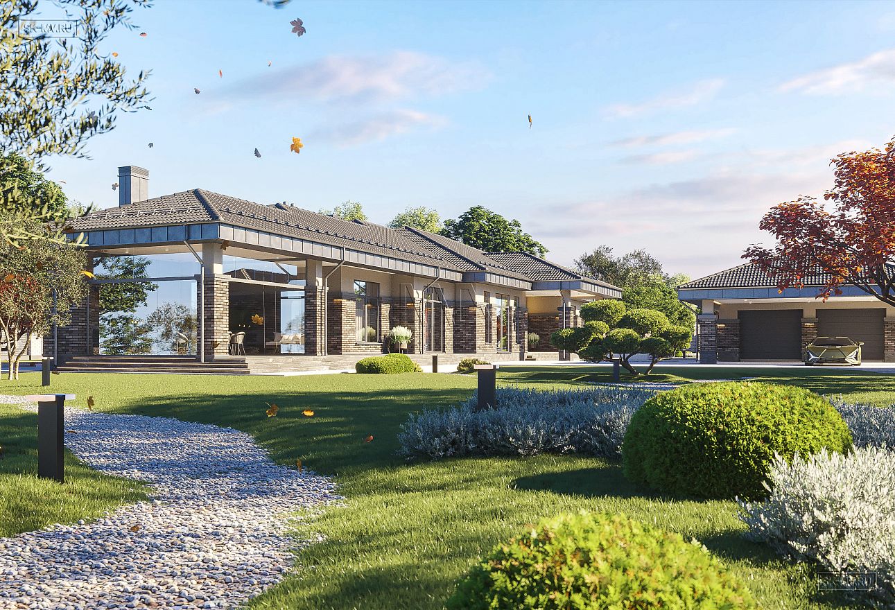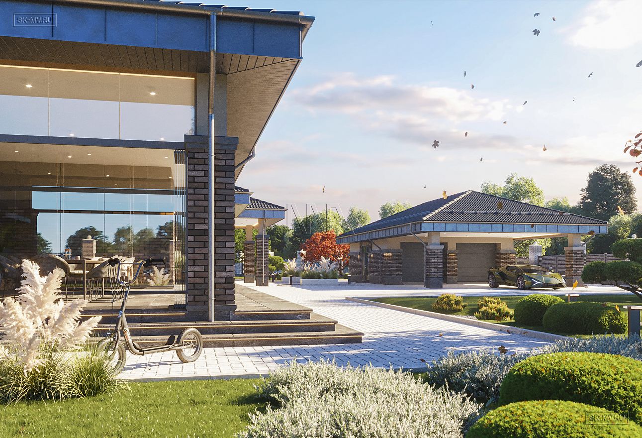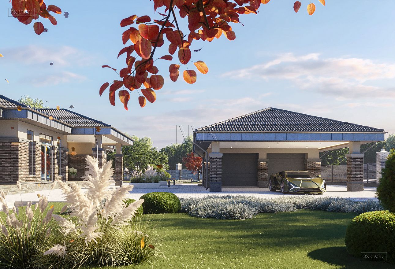 Проект одноэтажного загородного дома «Тула» в современном стиле с застекленной панорамной террасой барбекю и двухместным отдельно стоящим гаражом с навесом. Общая площадь — 368,47 кв.м.
