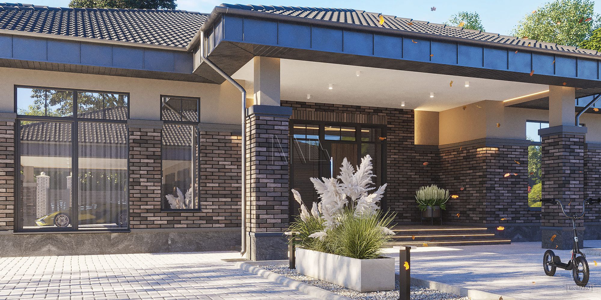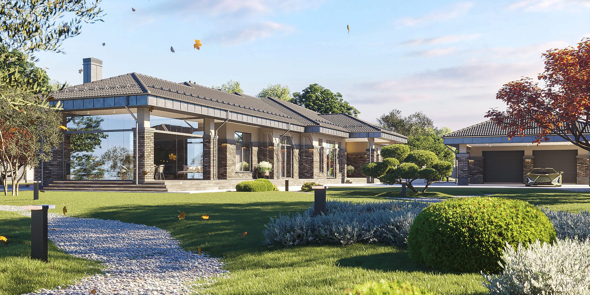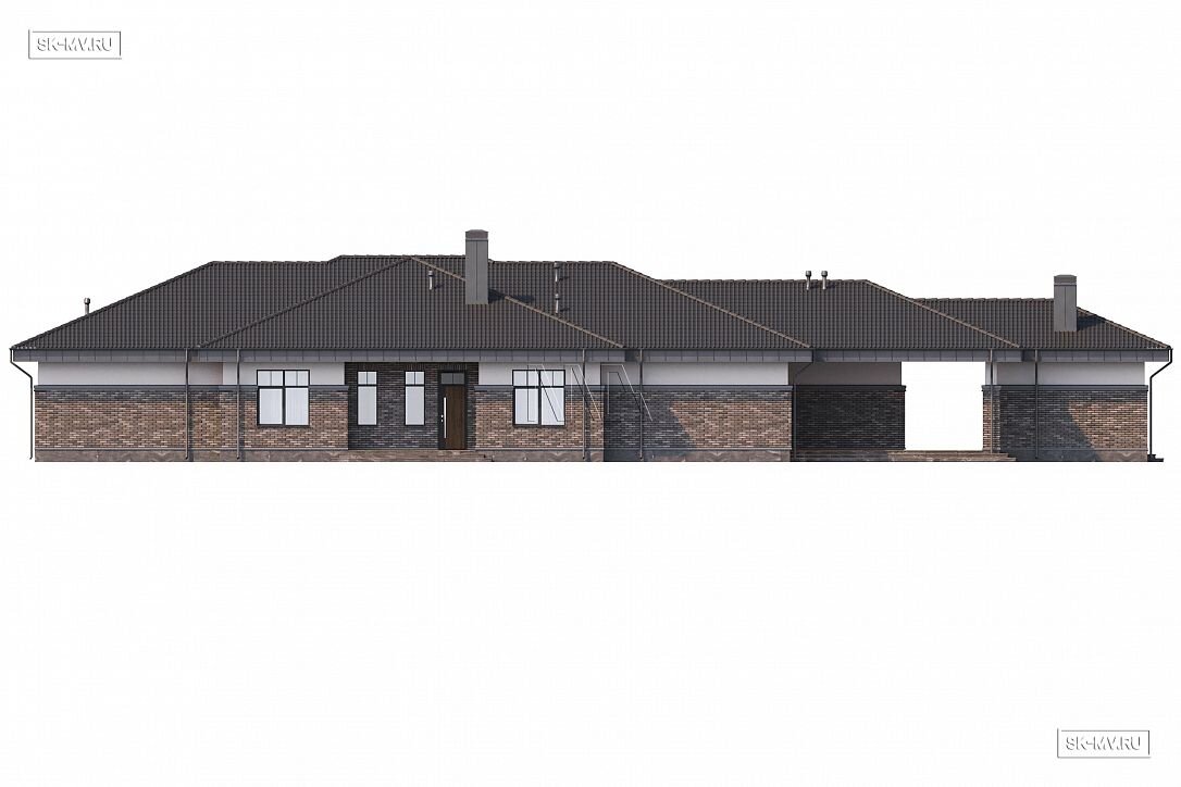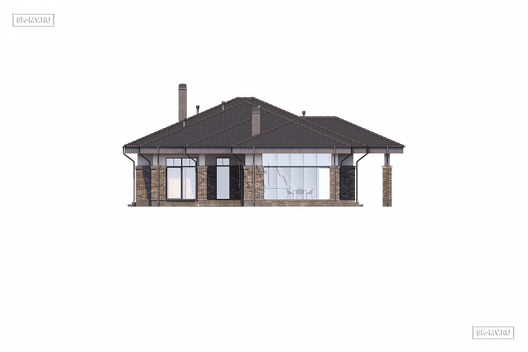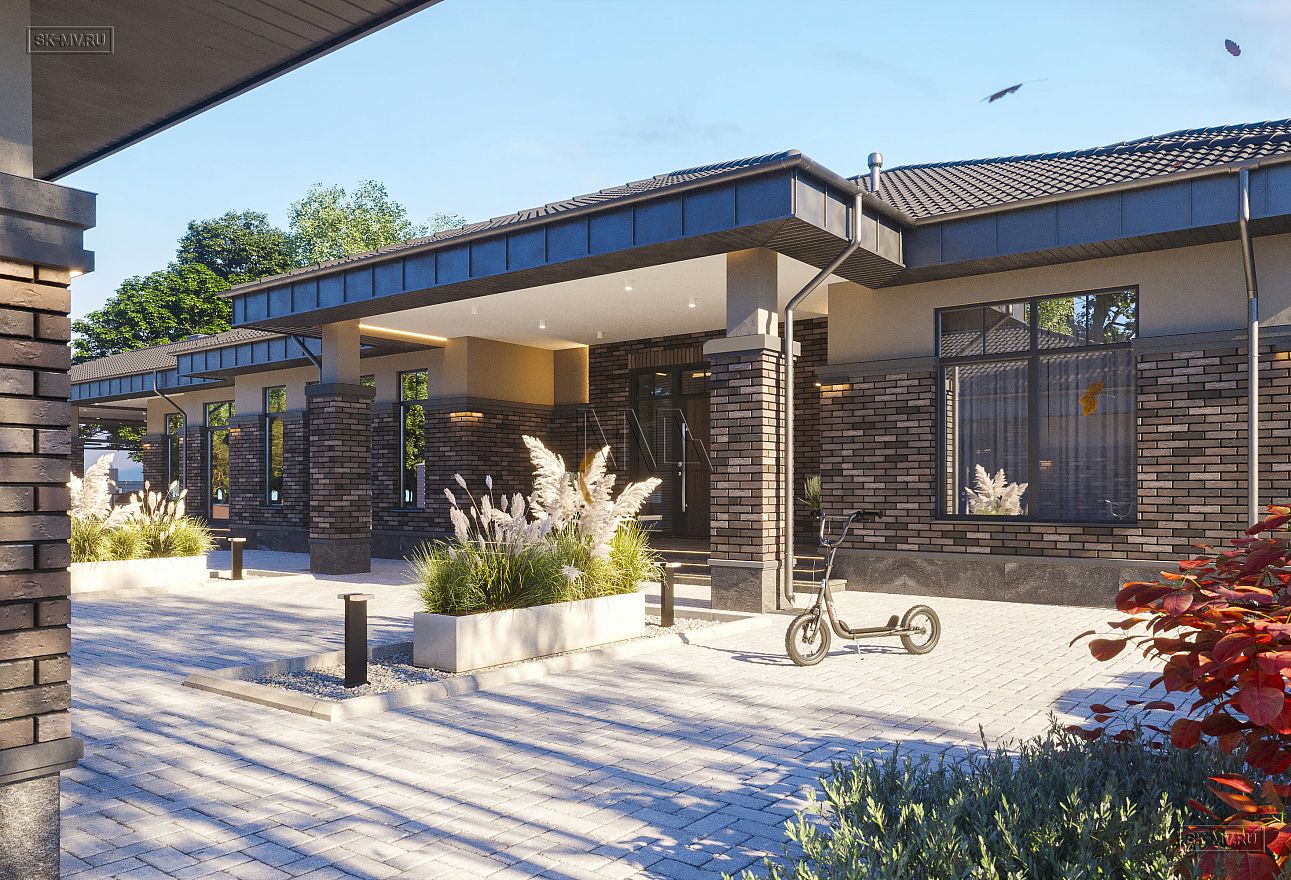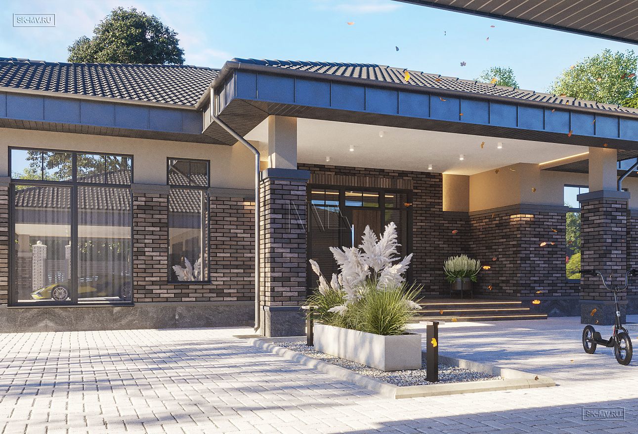 Проект одноэтажного загородного дома «Тула» в современном стиле с застекленной панорамной террасой барбекю и двухместным отдельно стоящим гаражом с навесом. Общая площадь — 368,47 кв.м.