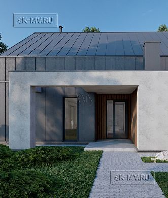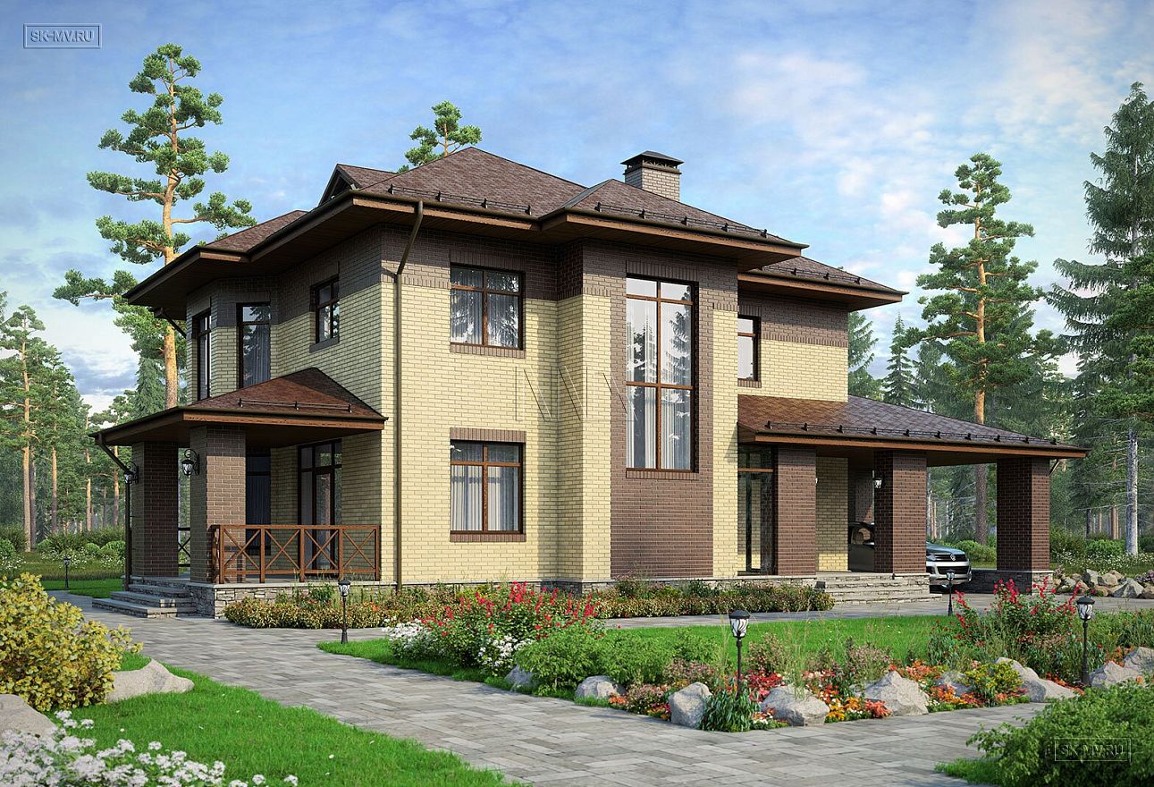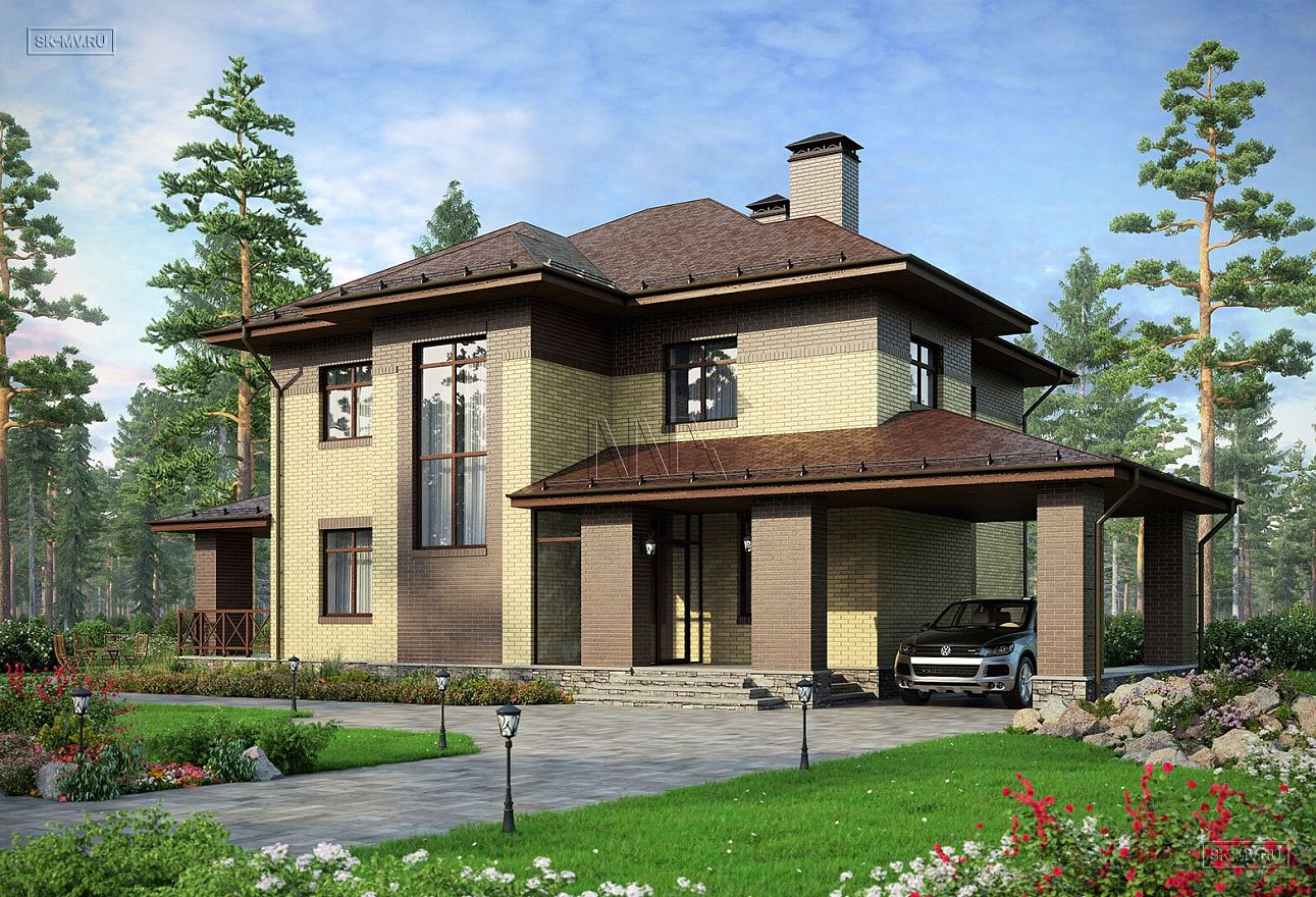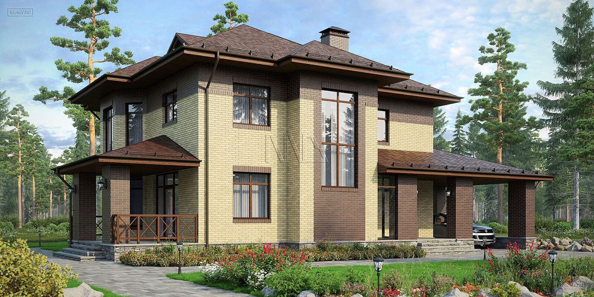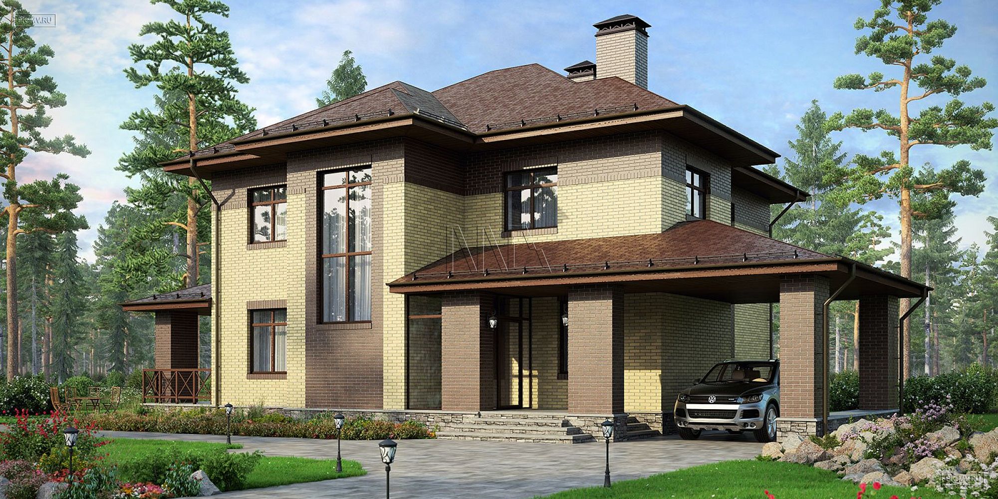 Проект частного кирпичного дома площадью 217 кв.м с навесом для автомобиля «Родовое поместье» — основательный и брутальный кирпичный коттедж в райтовском стиле. Вальмовая кровля с широкими вылетами, преобладание горизонтальные линий, ощущение сегментированности, массивные колонны и смешение отделочных материалов подчеркивают геометричность строения. Для отделки фасада обязательно используются качественные материалы: натуральный кирпич, камень, дерево, натуральная штукатурка.