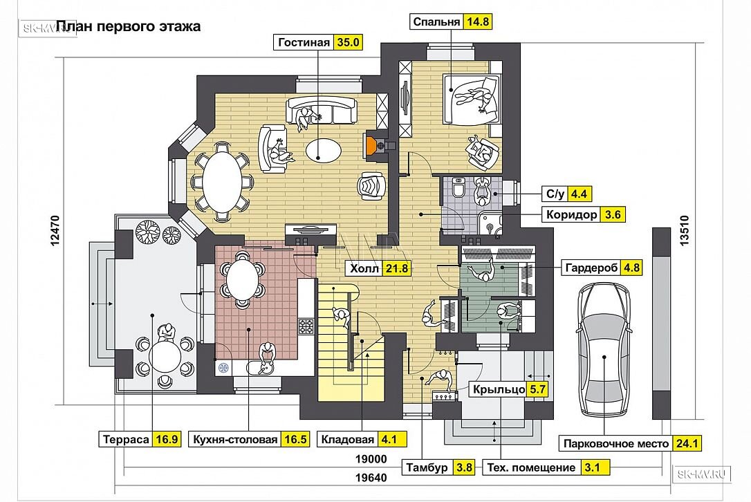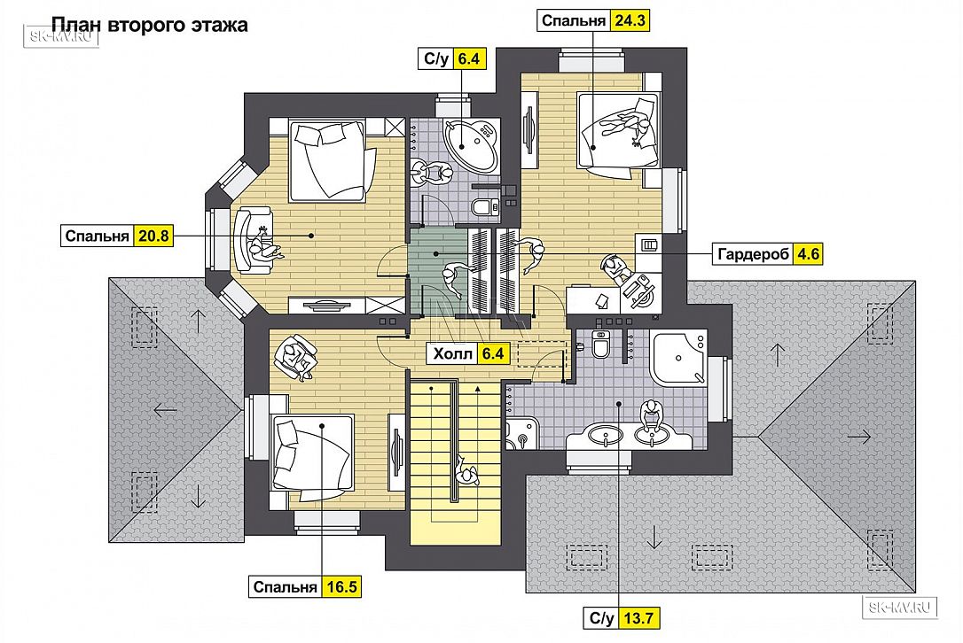 Проект «Родовое поместье» — это классический двухэтажный кирпичный дом. То есть коттедж с двумя полноценными этажами и чердаком (утепленным или холодным). На первом этаже традиционно расположен камин в гостиной, соединенной с кухней-столовой. Из кухни есть выход на небольшую террасу. В доме четыре спальни. Большая мастер-спальня на втором этаже для родителей с индивидуальной гардеробной и сан.узлом, а также две спальни поменьше для детей. Спальня на первом этаже может быть для гостей и пожилых родителей, может стать мастерской или отцовскими кабинетом.