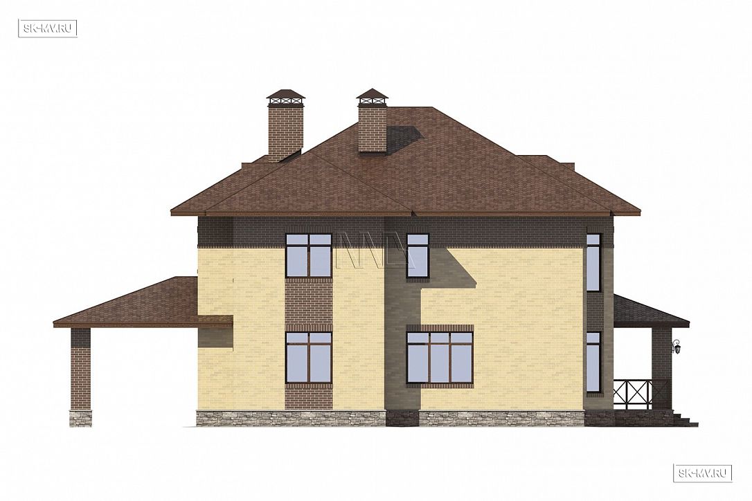 Родовое поместье — красивый кирпичный дом из желтого и коричневого отделочного кирпича с коричневой крышей. В представленном варианте кирпичная облицовка здания выглядит очень органично.