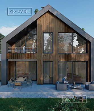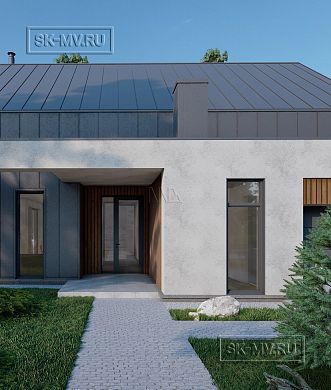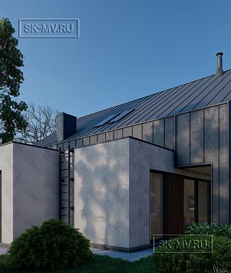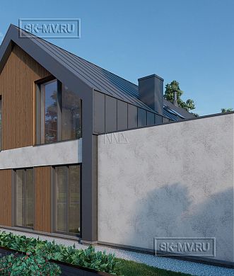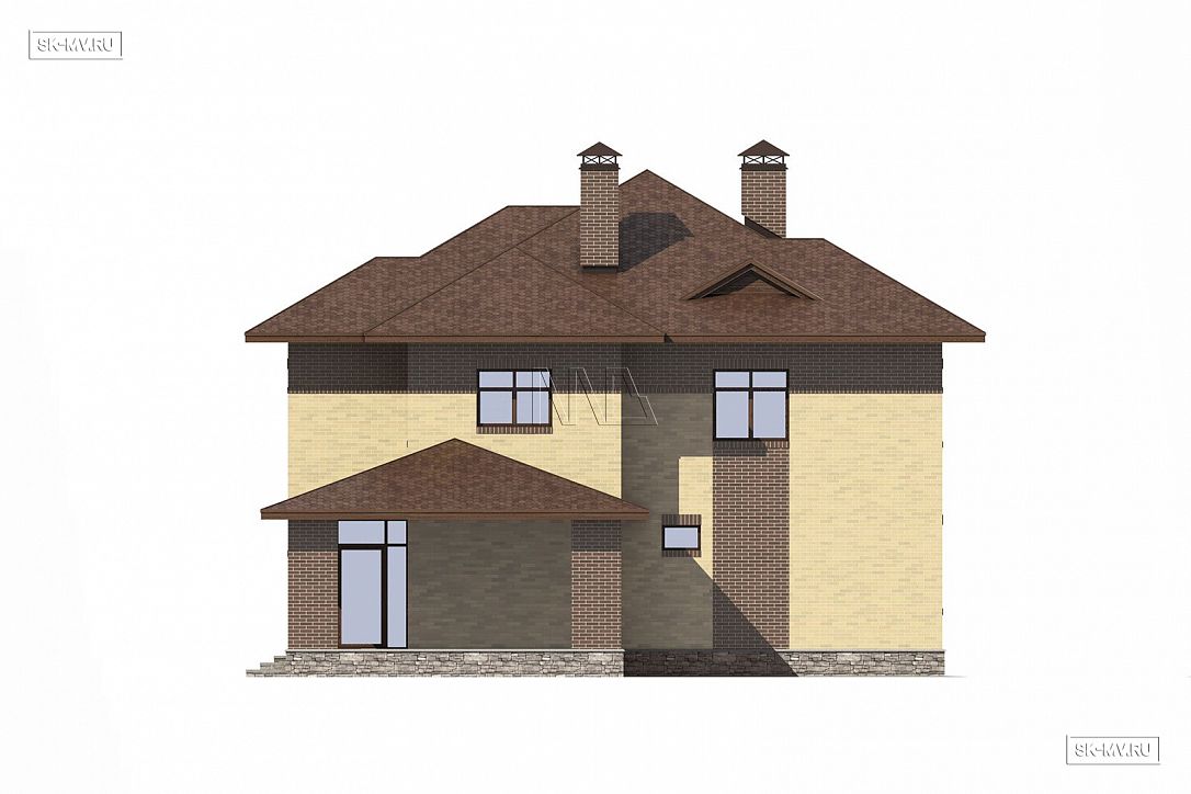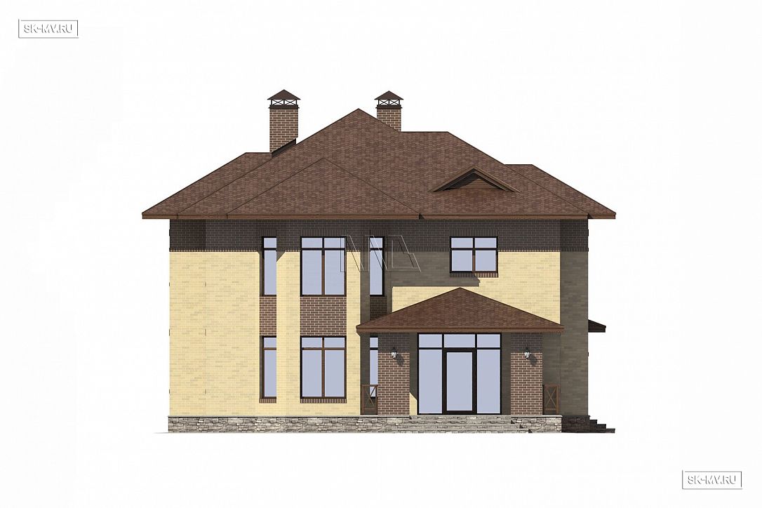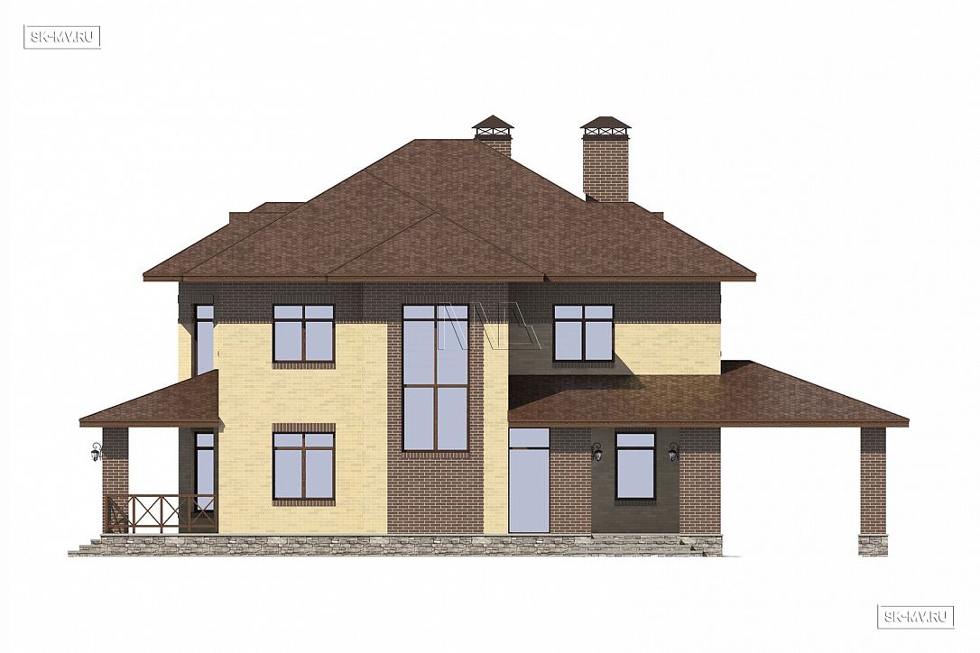 Простые геометрические формы фасадов, сложная многоуровневая крыша, тяжелые колонны террасы и крыльца облегчаются высокими окнами, комбинированной фасадной отделкой дома с разнонаправленной кладкой теплого желтого и приглушенного коричневого кирпича. Также интересен переход линии темного кирпича от цоколя вдоль высокого окна и далее в подкарнизное пространство, опоясывая здание по периметру.