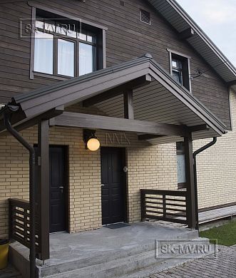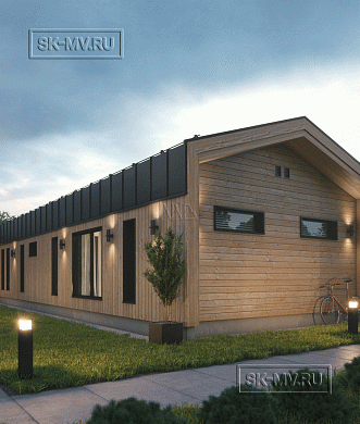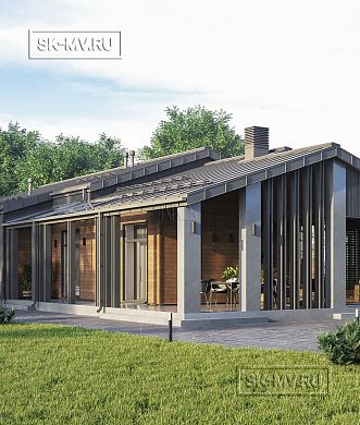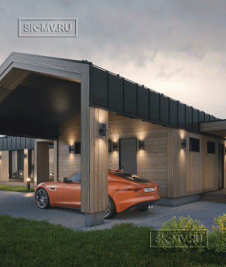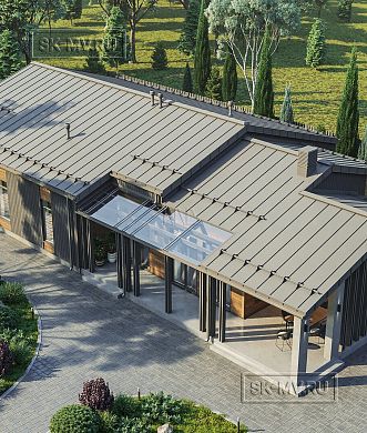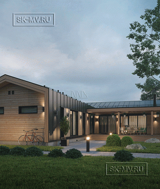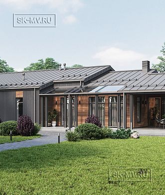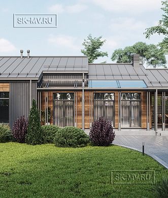 Элегантный облик экстерьера сформирован двускатной фальцевой кровлей без карнизных свесов, плавно перетекающая на фасад, и отделкой фронтальных частей дома красивым и долговечным темным планкеном из лиственницы. На монолитных элементах боковых фасадов темный планкен оригинально комбинируется со светлой штукатуркой. Приятный графитовый цвет кровли поддерживается и тоном оконных рам, и отделкой фронтонных свесов.