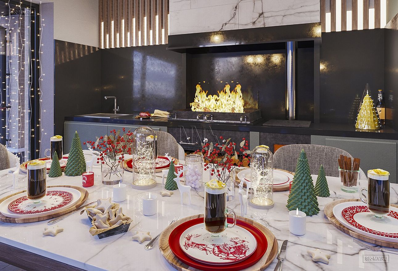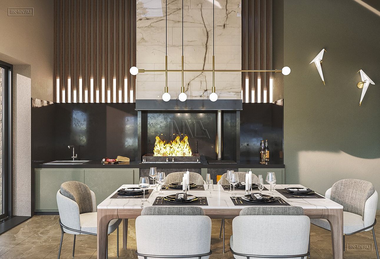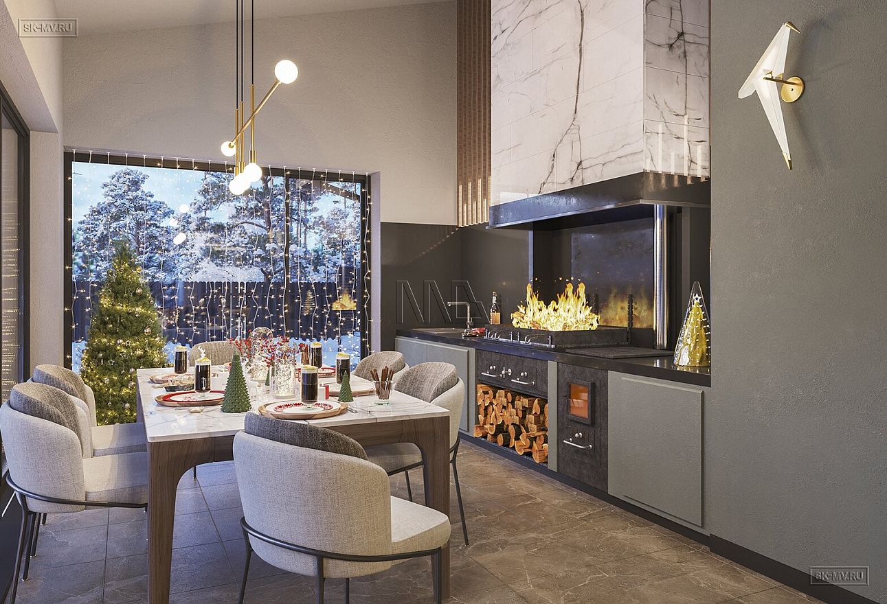 Угловая остекленная терраса барбекю дарит комфорт и ощущение защищенности. Смысловой доминантой в антураже террасы является печь с внушительным каменным порталом и широким дымоходом. Фундамент под печь закладывается при проектировании.