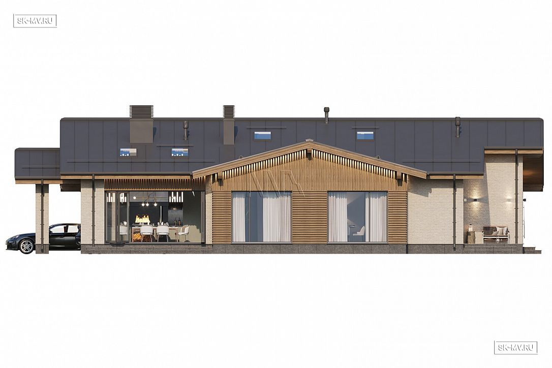 По низу тянется темная полоса цоколя, бетонных крылец и террас, выполненная в том же графитовом цвете, что и кровля, оконные профили и водосточная система.