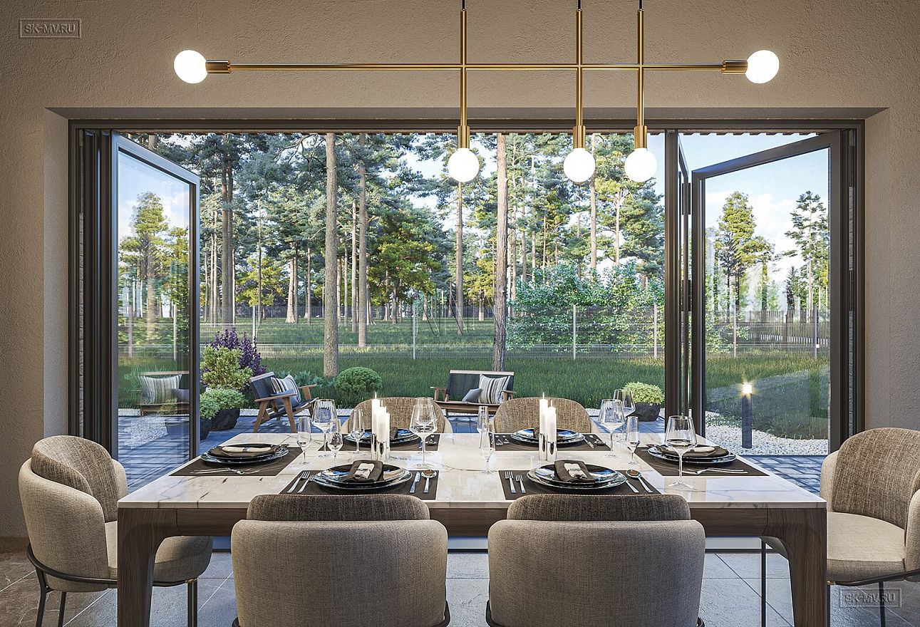 В этом проекте важно подчеркнуть наличие вокруг дома довольно просторной мощеной камнем пешеходной зоны, которая тянется от въездной группы и формирует пространство для летнего отдыха рядом с остекленной круглогодичной террасой-барбекю а потом бережно огибает дом по периметру.