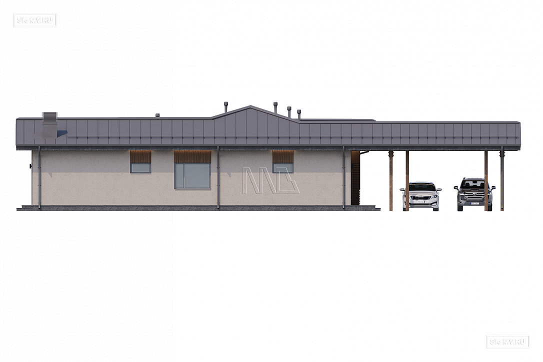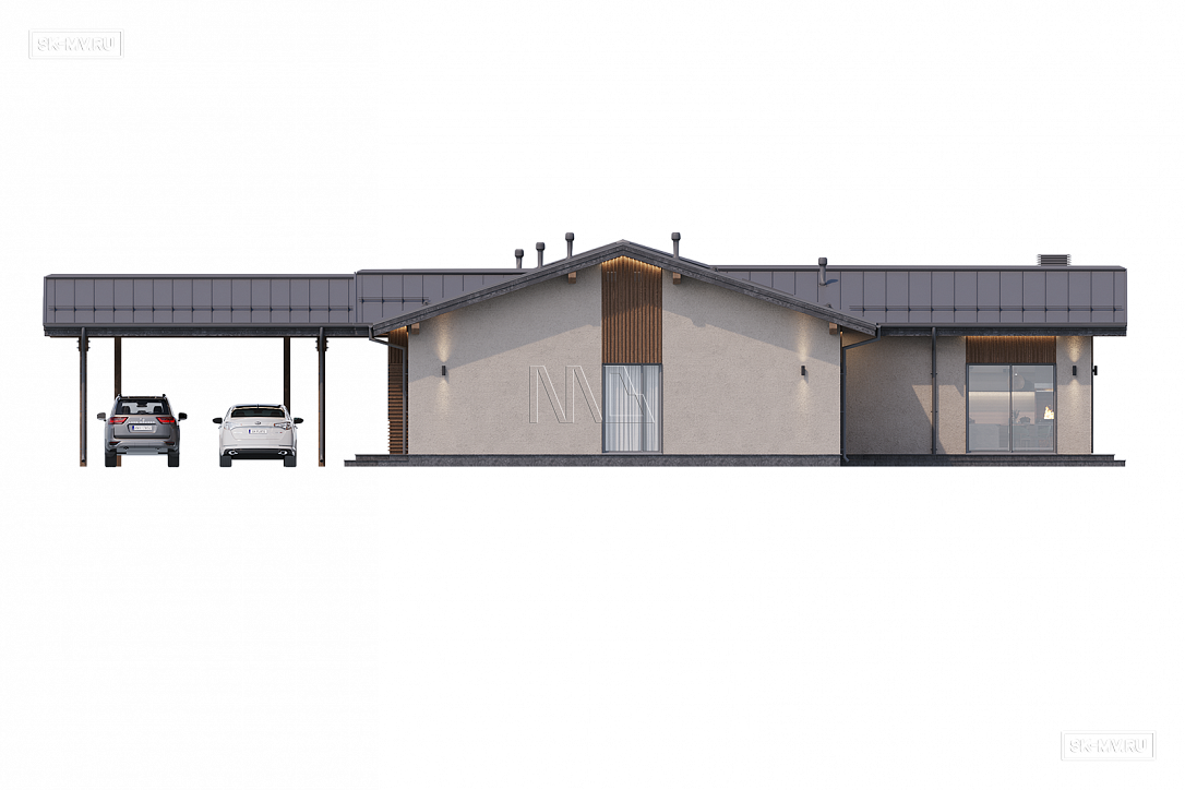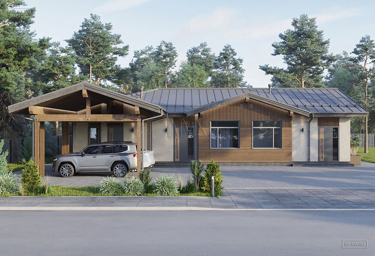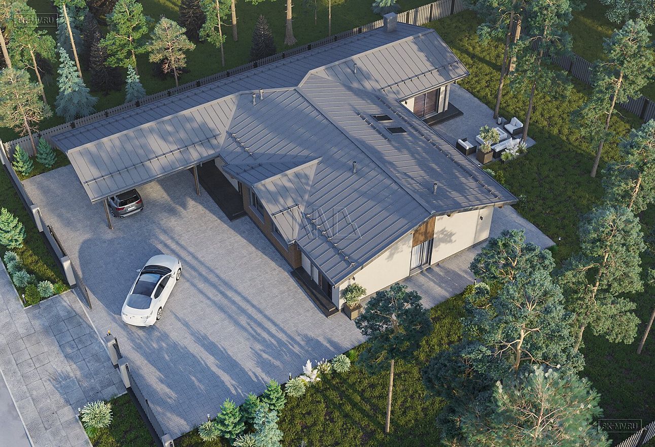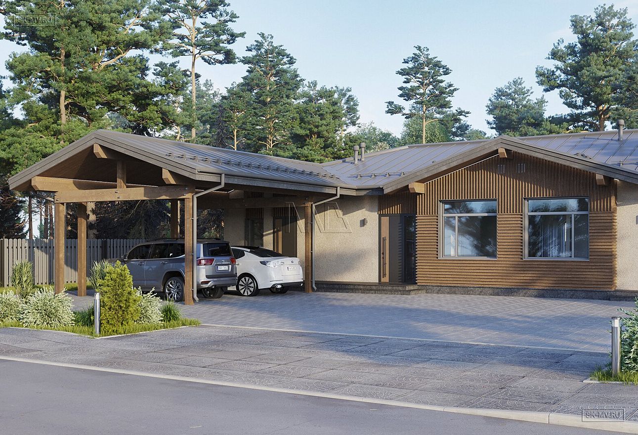Проект современного Т-образного одноэтажного загородного дома «Рощино 23» с сауной, террасой-барбекю и навесом для двух автомобилей. Площадь дома — 276,53 кв.м.