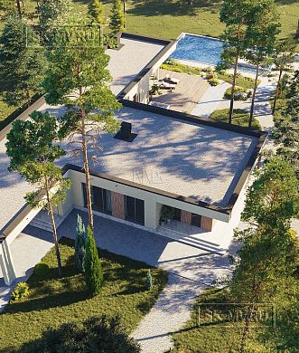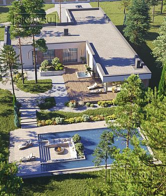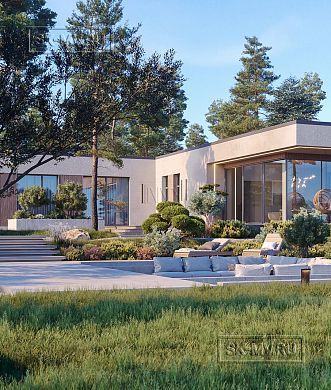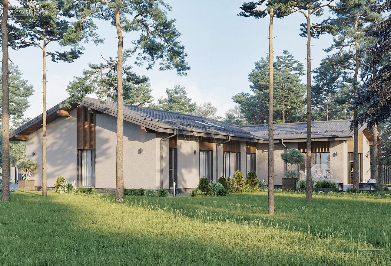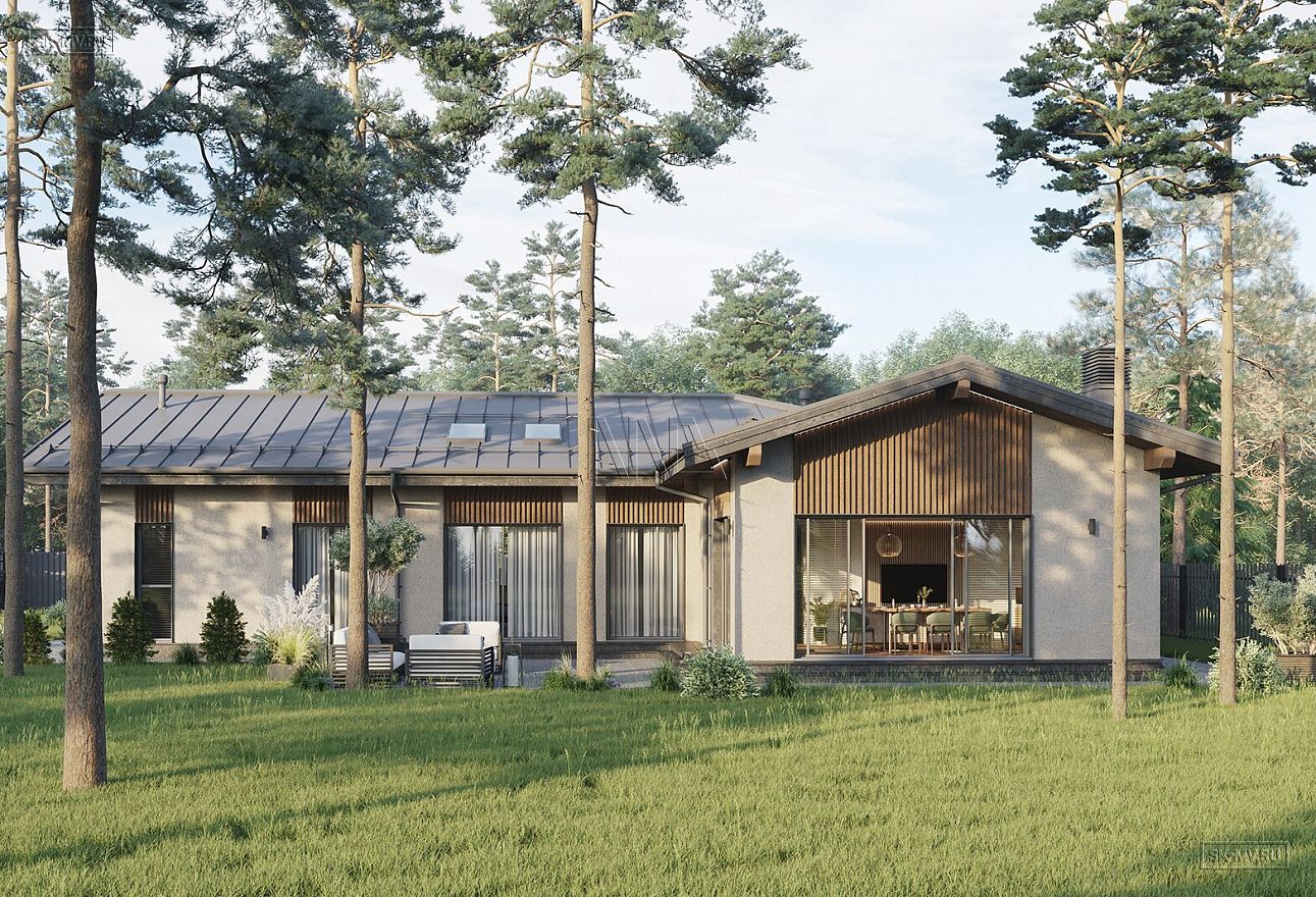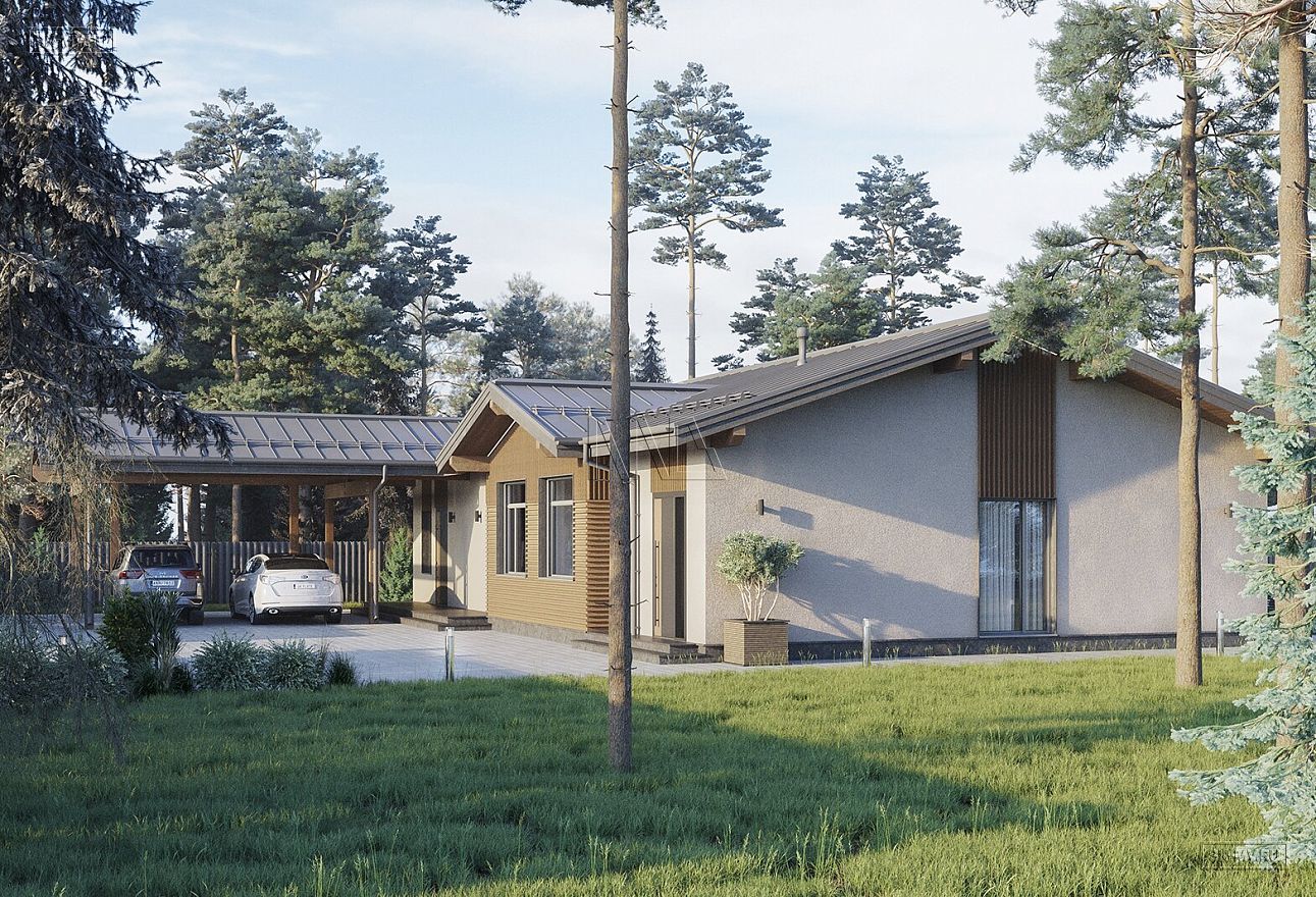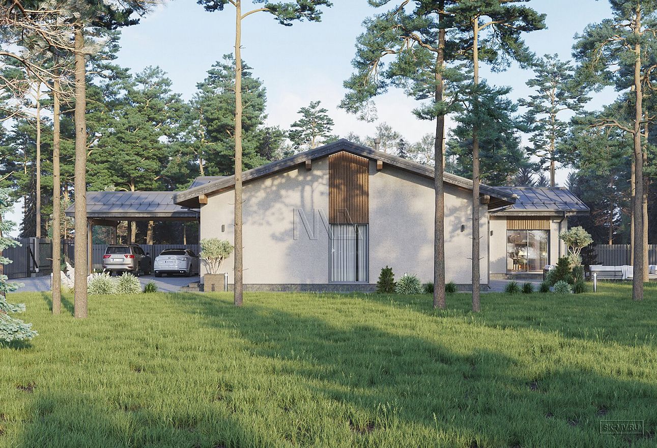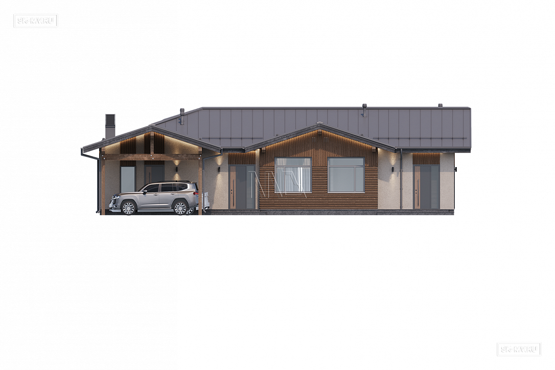 Проект современного Т-образного одноэтажного загородного дома «Рощино 23» с сауной, террасой-барбекю и навесом для двух автомобилей. Площадь дома — 276,53 кв.м.