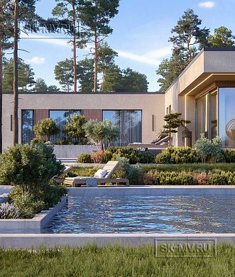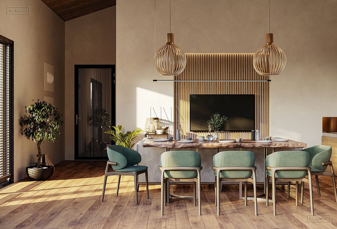 Экстерьер дома представлен темно-серой фальцевой кровлей и светлой штукатуркой на фасаде, декорированной вставками из деревянных реек с подстветкой. Подсветка дает возможность подчеркнуть оттенок и красивый рисунок текстуры дерева с помощью света.