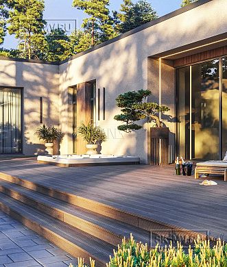Т-образная форма дома формирует внутренний приватный дворик, а расположившееся в нем небольшое патио создает особую атмосферу внутри дворика, являясь воплощением полного единения с природой и ненарушения естественной гармонии.