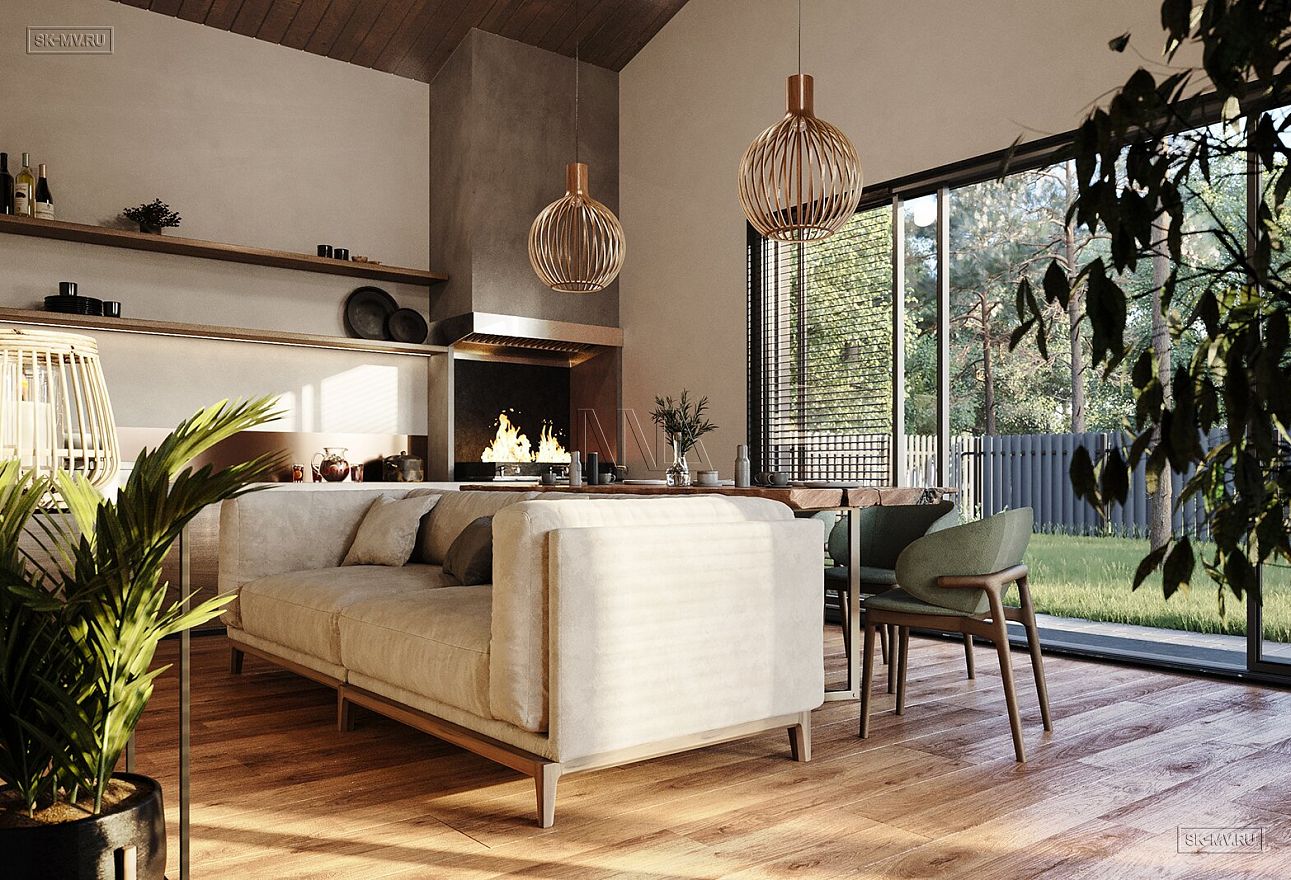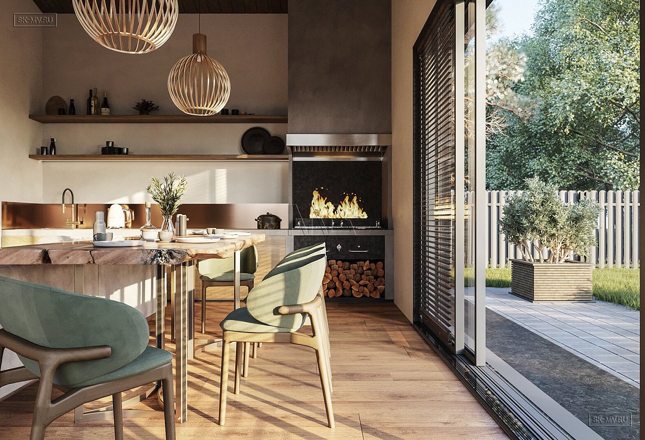 Гостиная имеет выход на теплую террасу и во внутренний двор. Теплая терраса с зоной барбекю и сауной — уютное место для отдыха в любое время года.