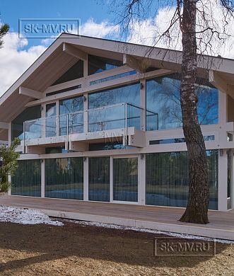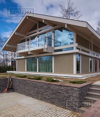 Можно отметить важный акцент — большие панорамные окна по периметру дома. Они делают фасад воздушным, за счет чего мы не чувствуем массивности фасадного камня.