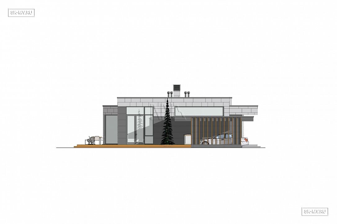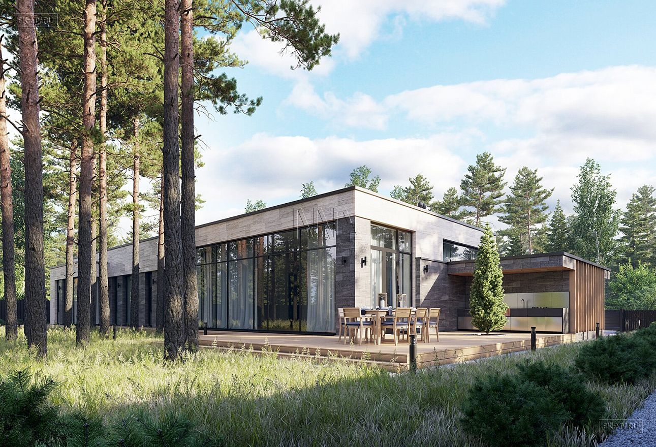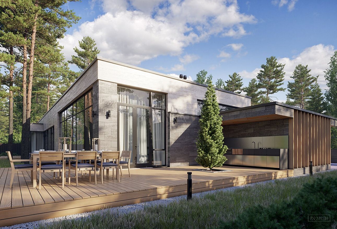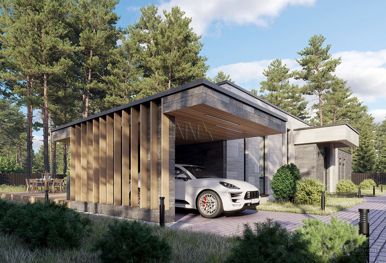 Проект «Рощино Клуб» — одноэтажный дом в современном стиле площадью 270,08 кв.м с плоской кровлей, большой открытой террасой (95,82 кв.) и навесом для автомобиля.