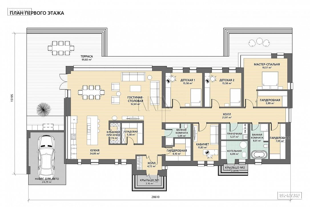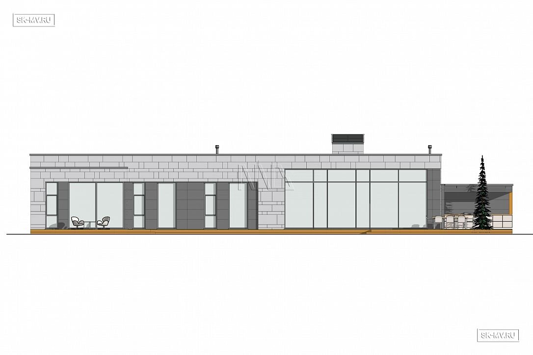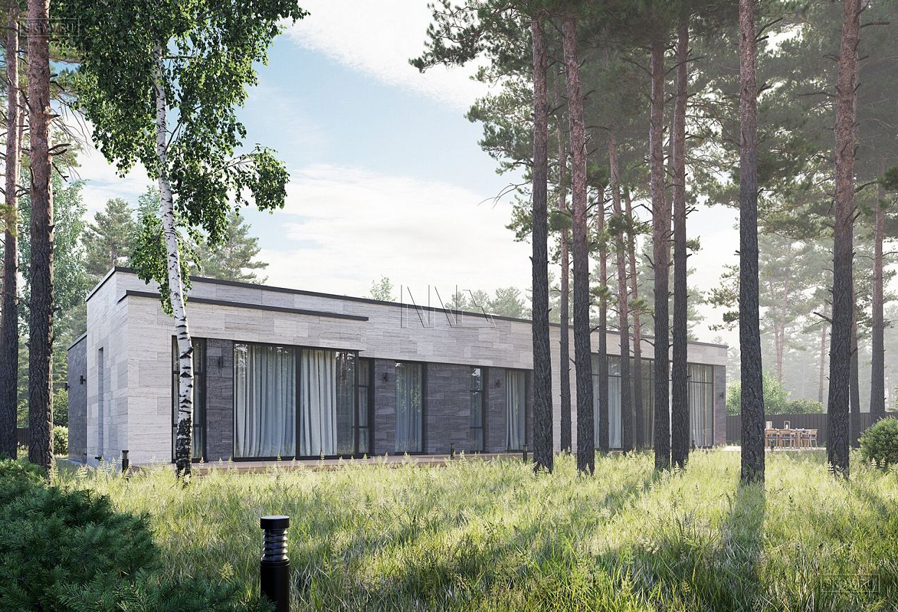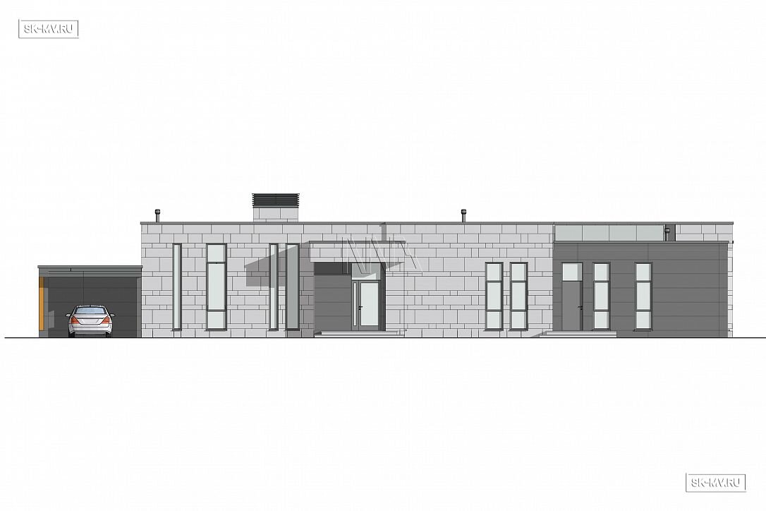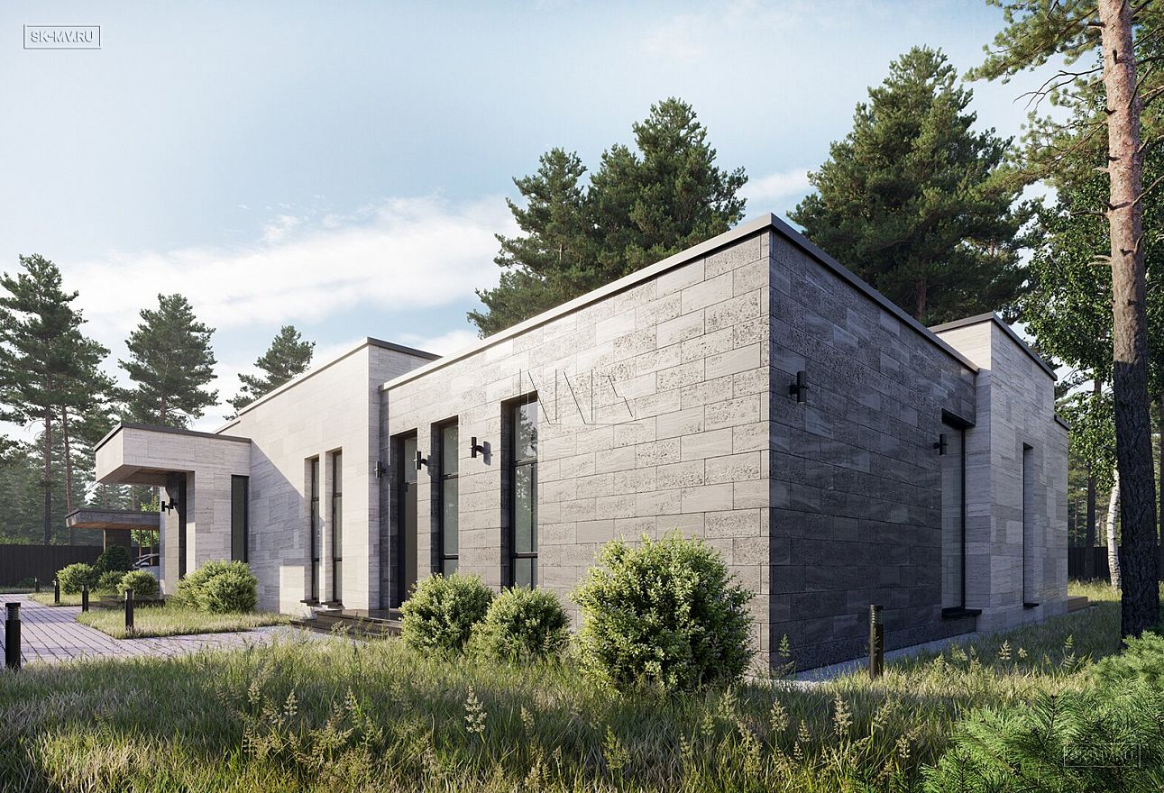 Проект «Рощино Клуб» — одноэтажный дом в современном стиле площадью 270,08 кв.м с плоской кровлей, большой открытой террасой (95,82 кв.) и навесом для автомобиля.