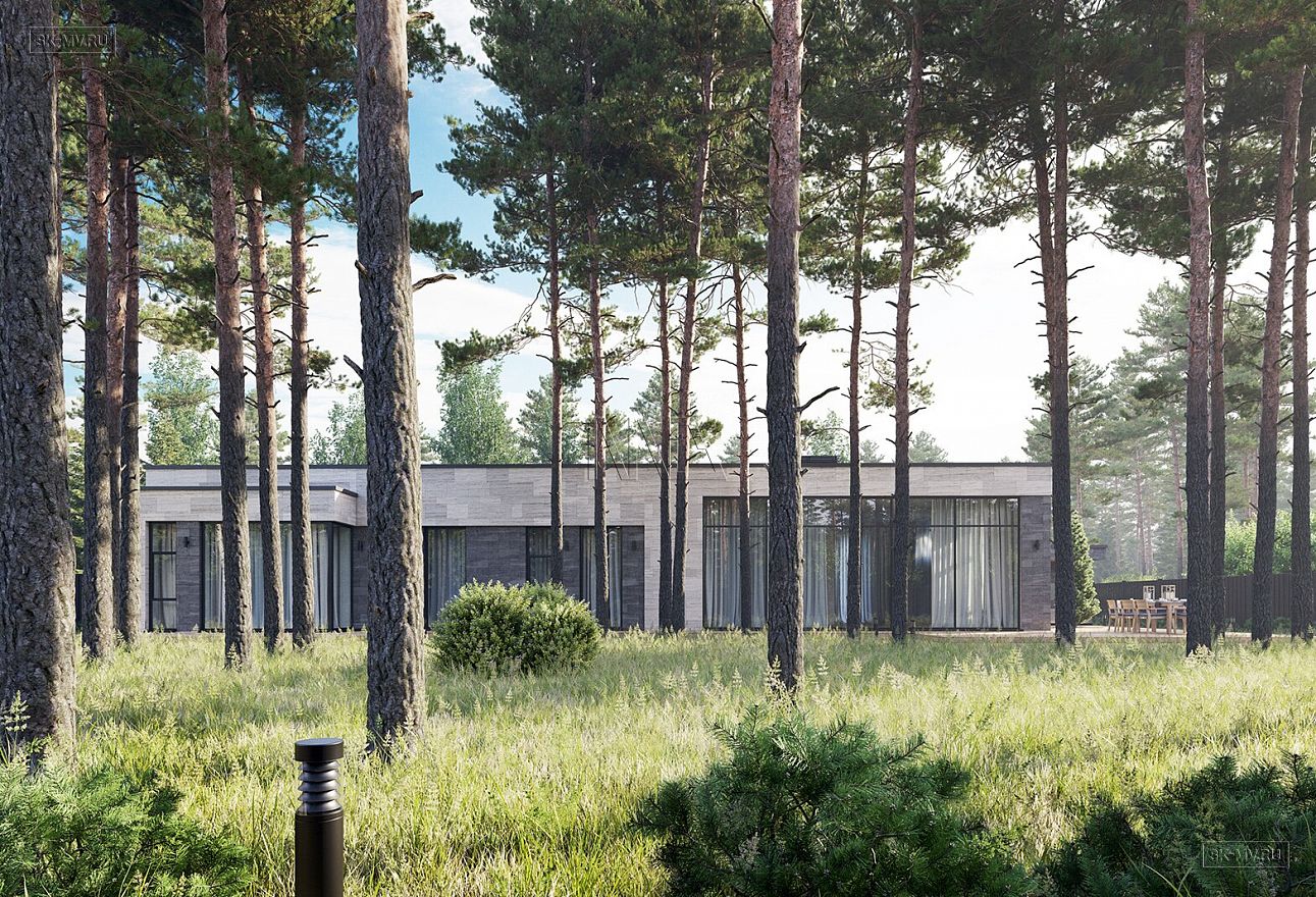 Визуализация этого проекта выполнена в двух вариантах фасадной отделки по просьбе заказчика. Это комбинация облицовочных керамических плит с лиственничным планкеном в двух цветовых решениях: темном и светлом.