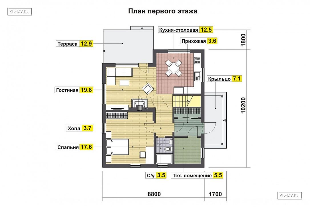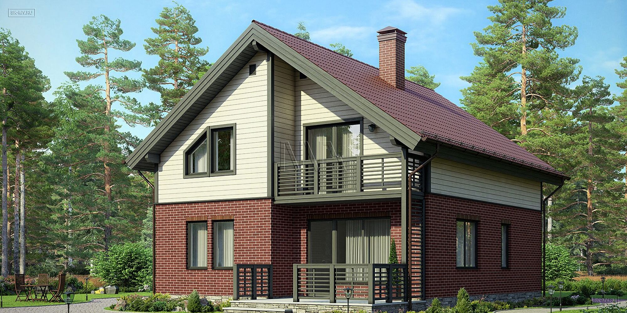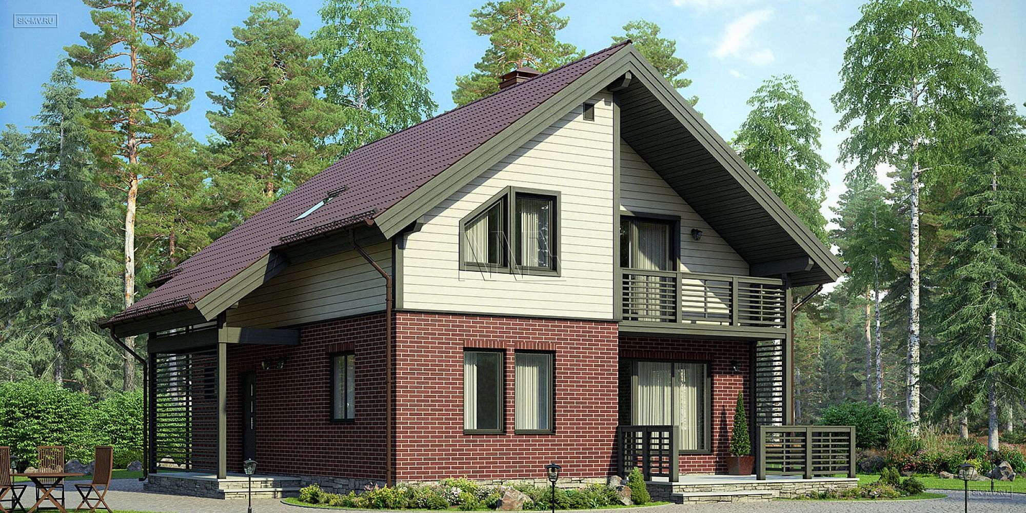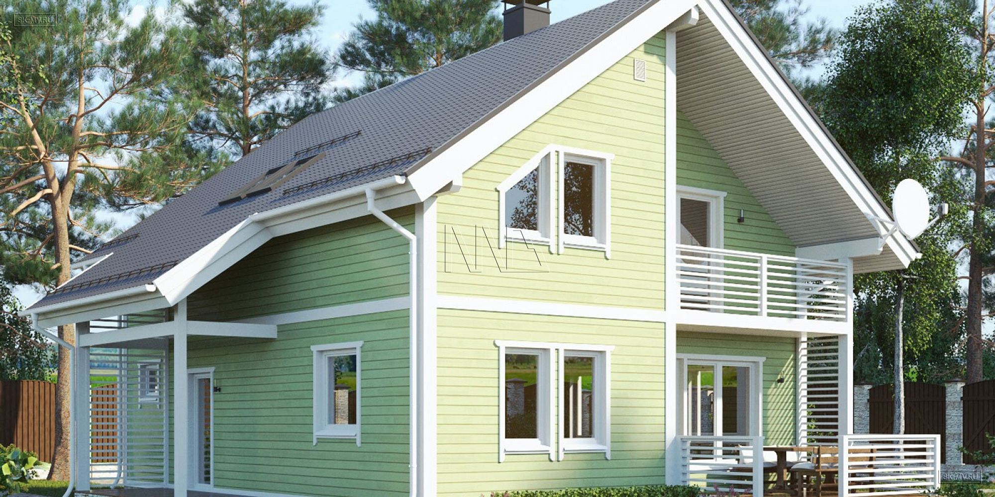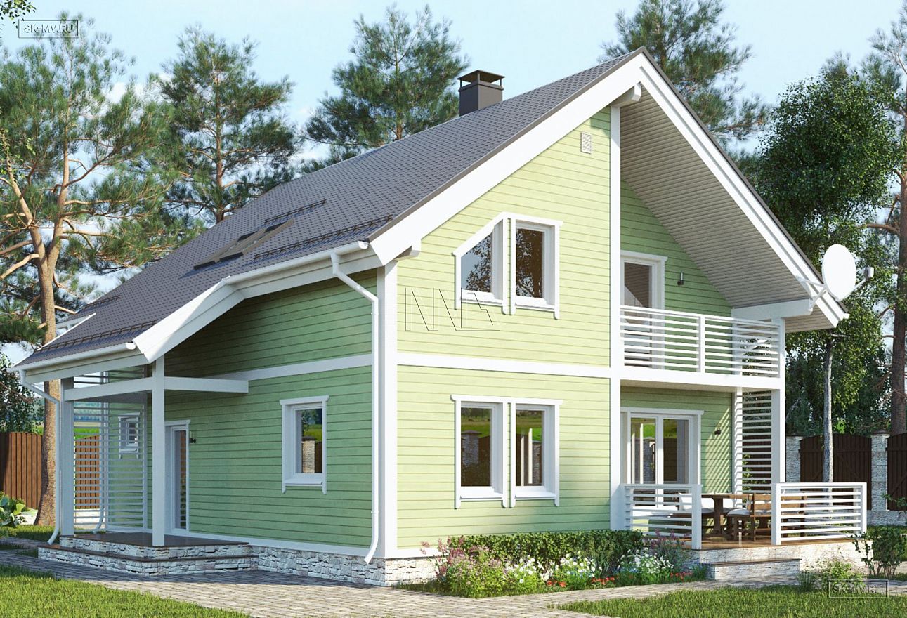 1. Да, это проект с классической двускатной кровлей с мансардными окнами, небольшой террасой и балконом. Но асимметрия главного фасада и воздушные ограждения террасы, балкона и крыльца из планкена придают этому дому особую легкость.