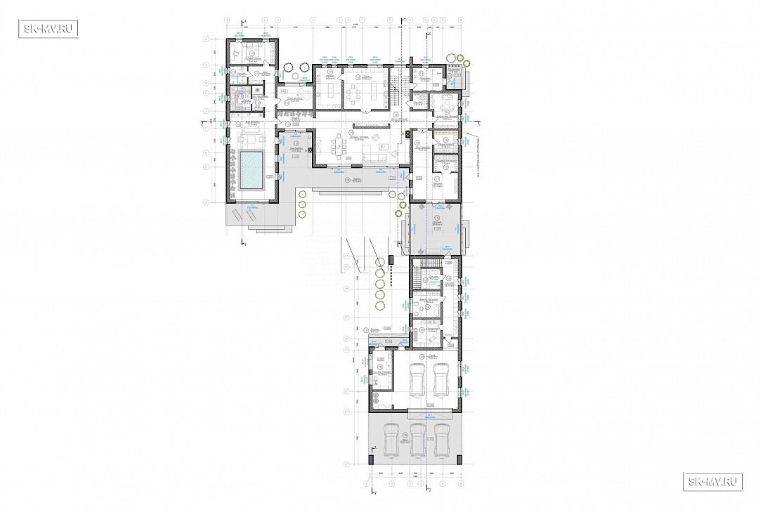Пройдя через большое крыльцо, можно попасть в модуль с хозяйственными помещениями: здесь расположены комната персонала, постирочная, садовый хозблок, выход к гаражу и автонавесу. Гараж на два места и навес на три места позволяют с удобством разместить автомобили хозяев и гостей.