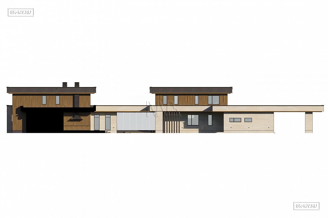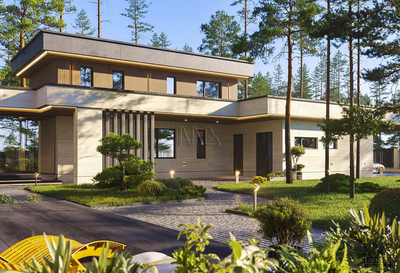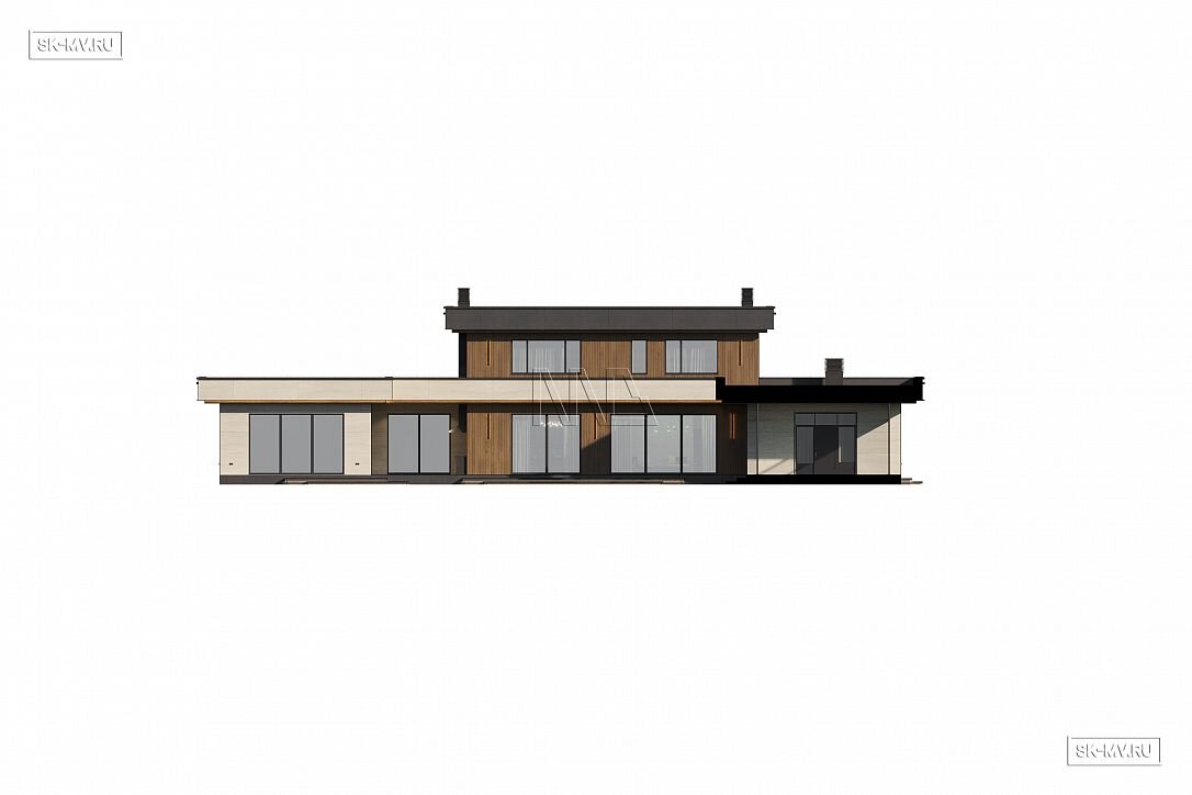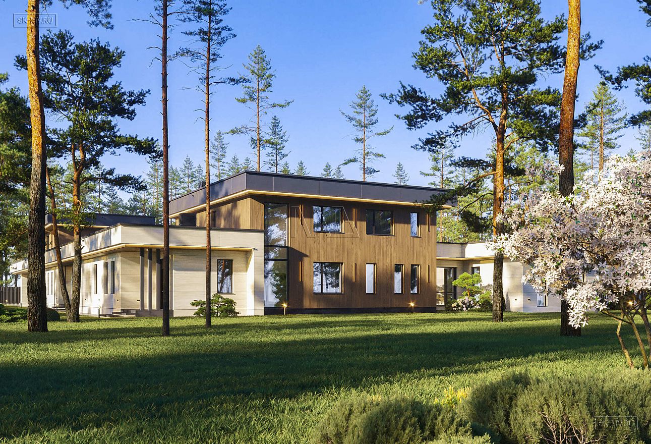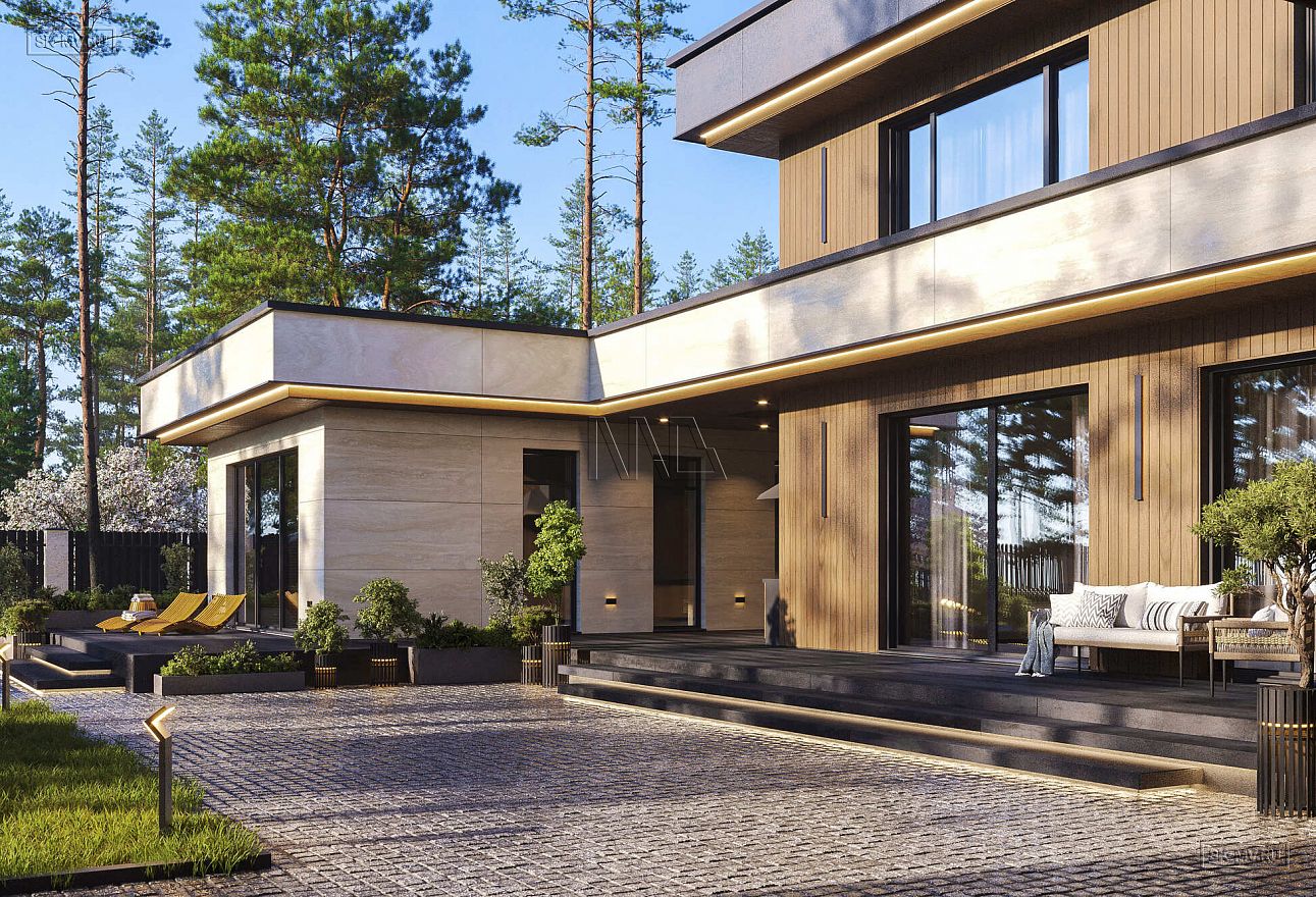 Это большой комфортабельный дом, фасады которого украшает облицовка деревом и керамогранитом. Он будет особенно выгодно смотреться на открытом участке с эстетичным ландшафтным дизайном.