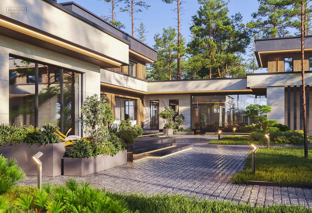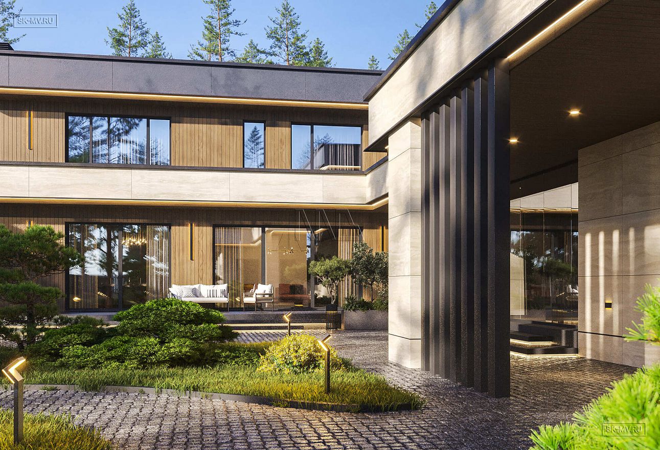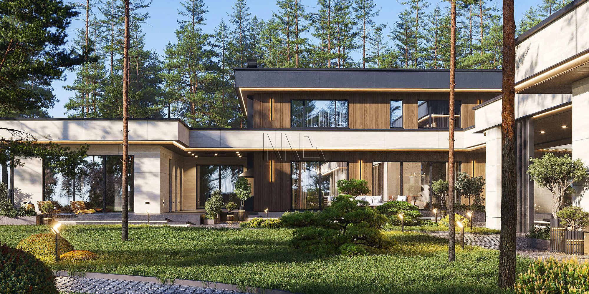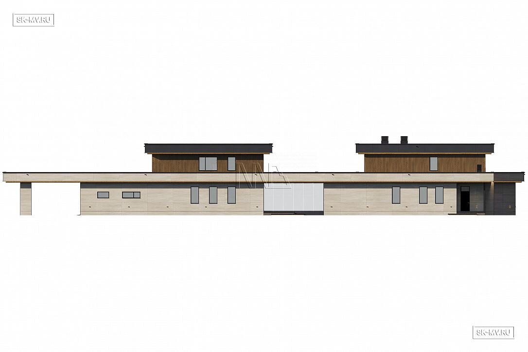 Это большой комфортабельный дом, фасады которого украшает облицовка деревом и керамогранитом. Он будет особенно выгодно смотреться на открытом участке с эстетичным ландшафтным дизайном.