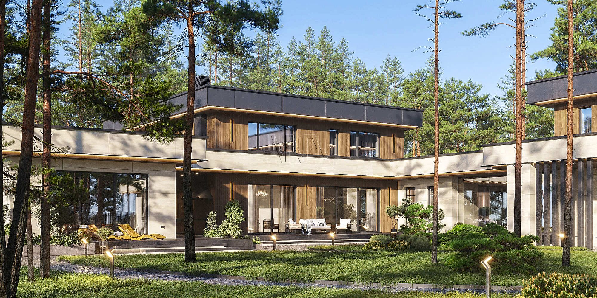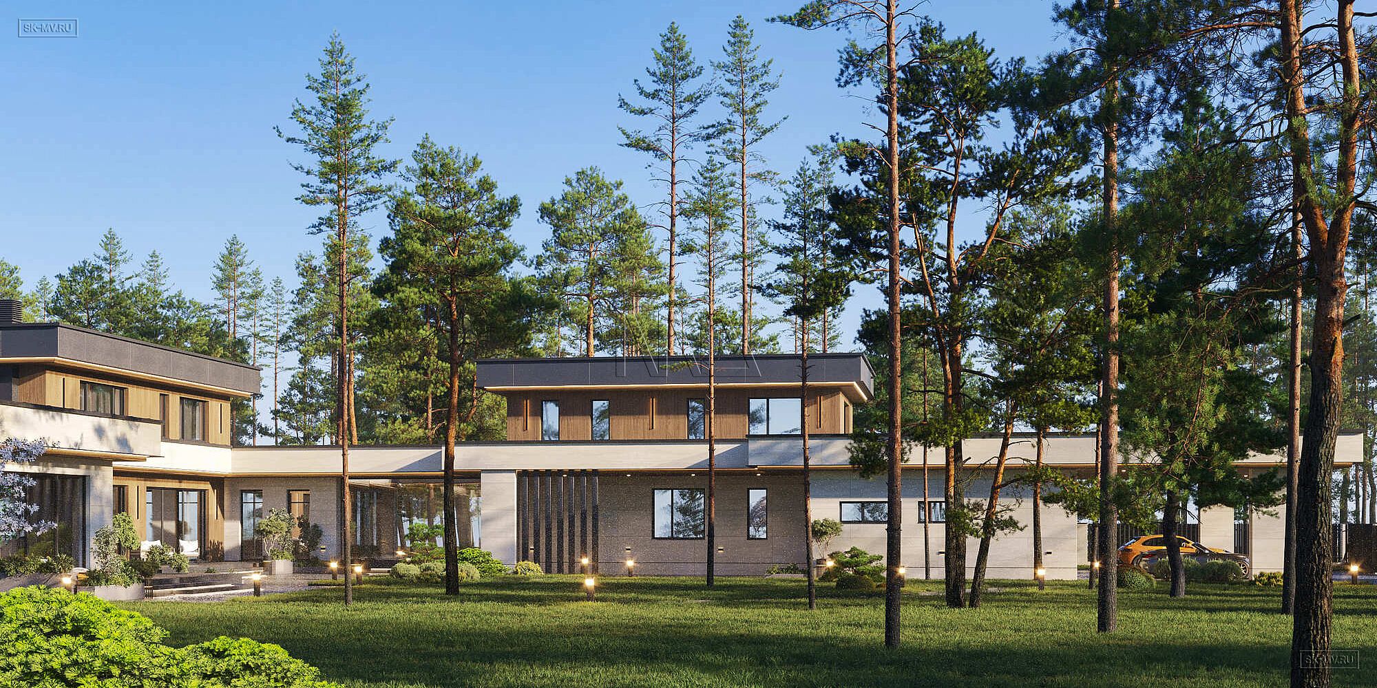 Проект двухэтажного загородного дома «Солнцево» в современном стиле с бассейном, сауной и пятью спальнями. Общая площадь — 861,95 кв.м.