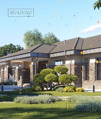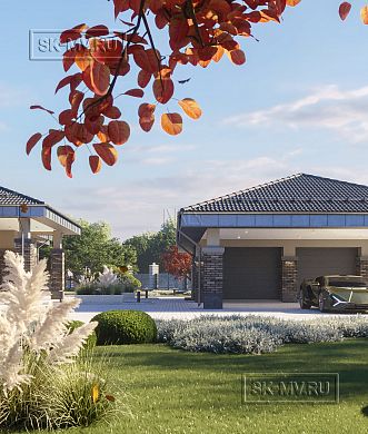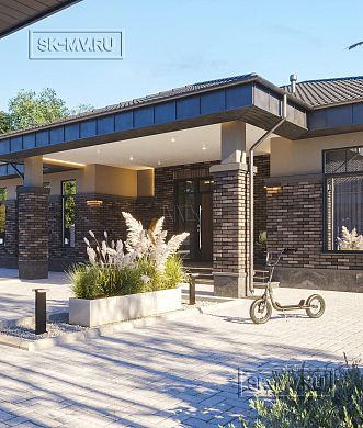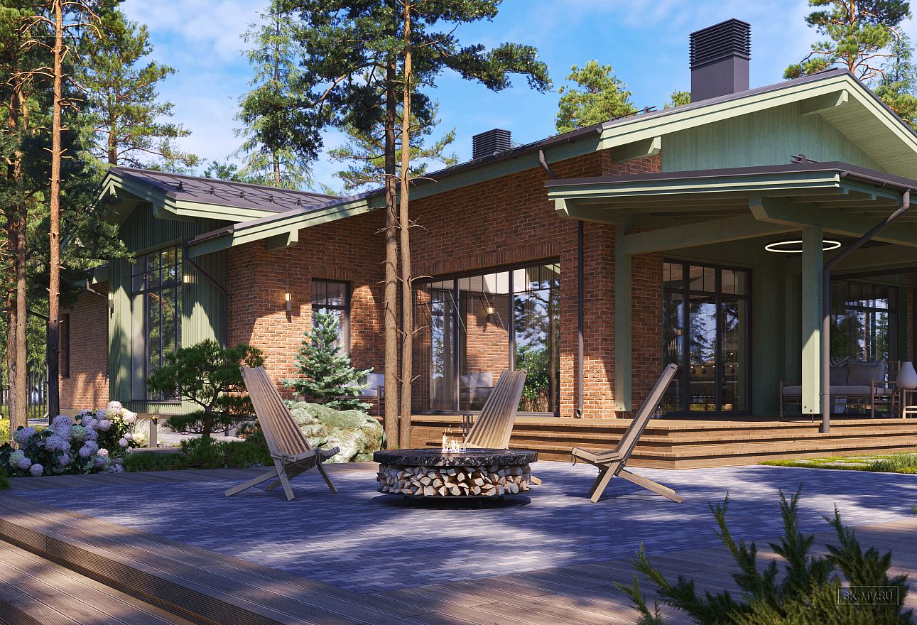 Проект современного одноэтажного загородного дома «Сосновая аллея» в современном скандинавском стиле с мастер-спальней, двумя детскими, хамамом в спа-зоне, теплой террасой-барбекю и навесом на два автомобиля. Площадь дома — 308,6 кв.м.
