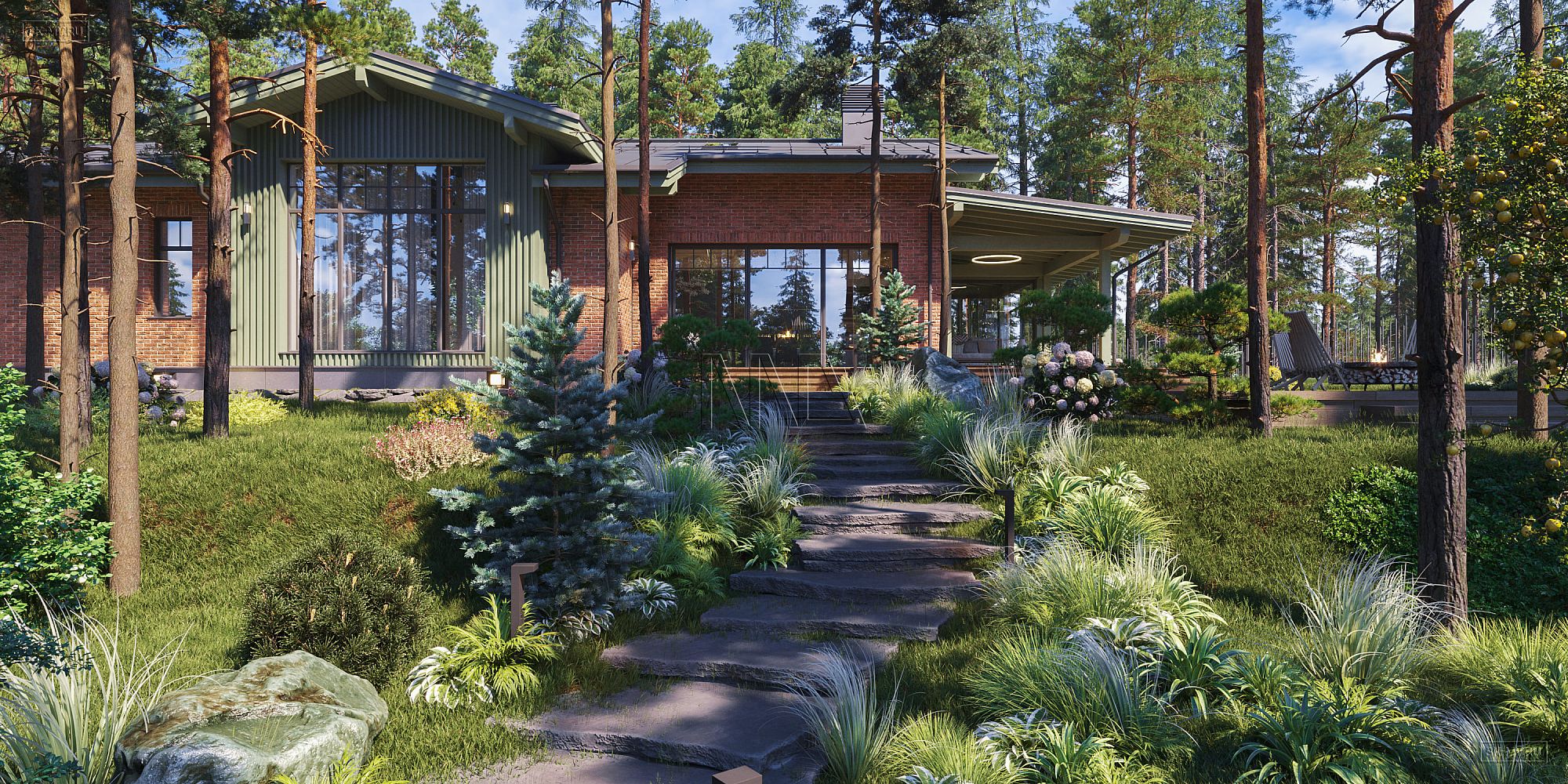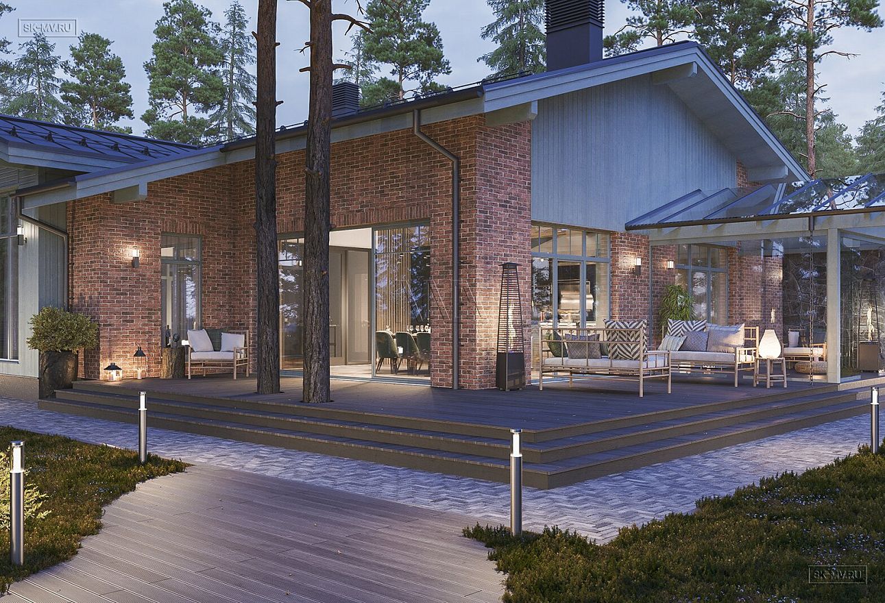 Для этого дома архитектор предложил три варианта комбинированной отделки главного фасада: сочетание пестрого красного клинкерного кирпича с оливкового цвета деревом и серым отделочным камнем. Неизбитое сочетание цветов идеально вписывается в окружающий лесной ландшафт.