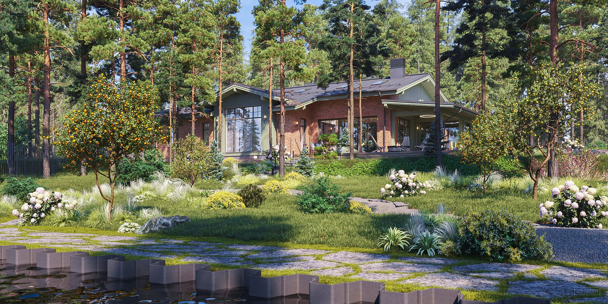 Архитектурный проект всегда учитывает множество моментов, в том числе рельеф участка, результаты топографической съемки, стороны света, наличие крупных деревьев, которые хочется сохранить, подъездные пути и т.д.