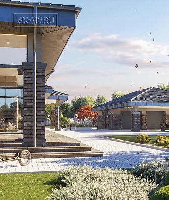 Данный проект интересен тем, что дом расположен в самой высокой точке участка. Окна гостиной и основная терраса обращена внутрь участка на юго-запад, что означает что практически целый день на ней будет солнечно. Въездная группа и хозяйственные помещения расположились с севера.