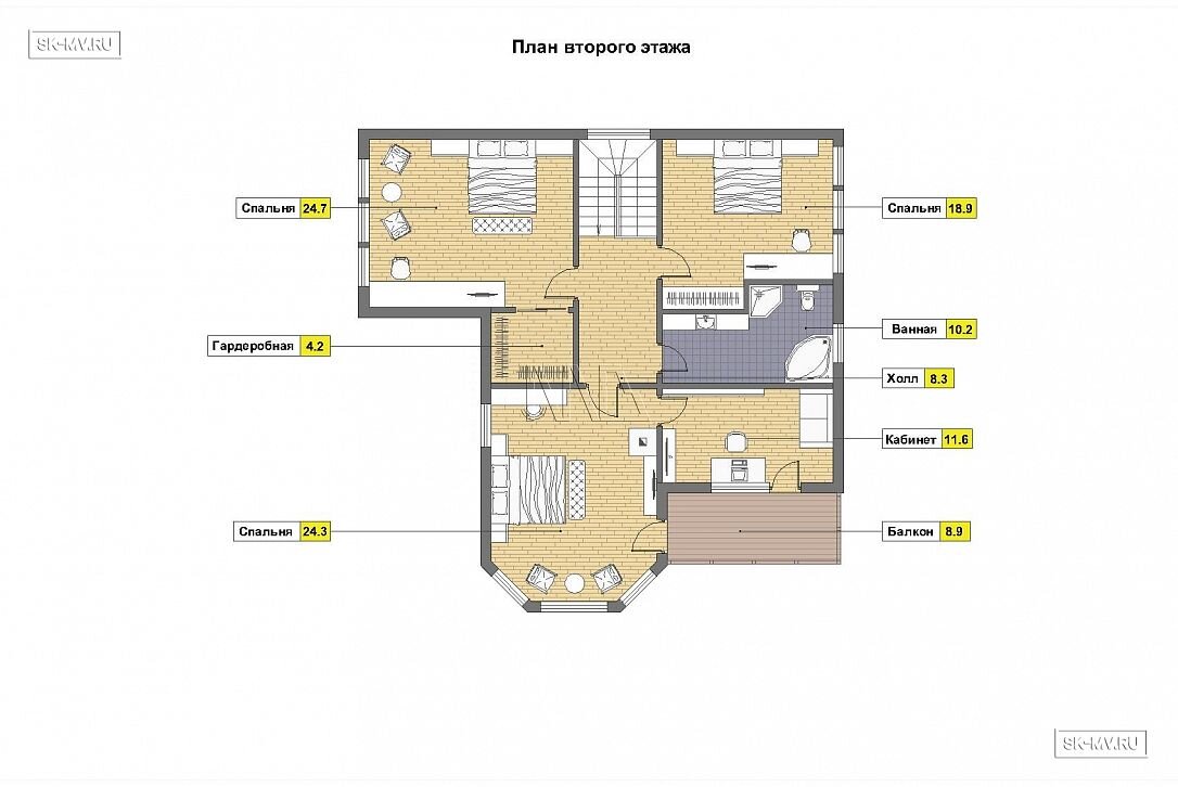 На втором этаже расположились еще три спальни с окнами и на восток, и на запад. Одна из просторных спален имеет свой гардероб вместо шкафа-купе. А хозяйская спальня в эркере соединена с рабочим кабинетом и имеет выход на балкон.