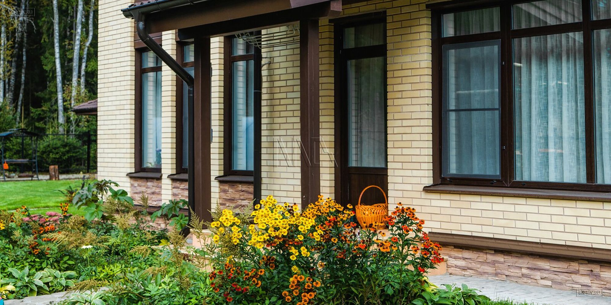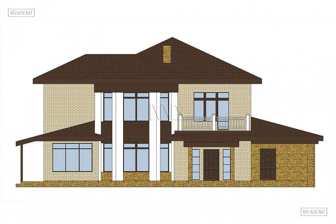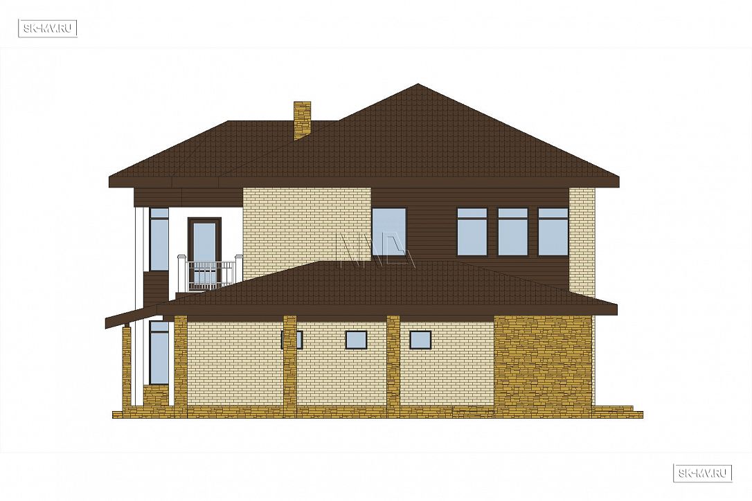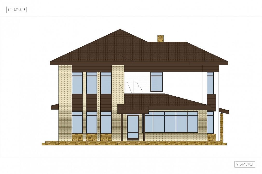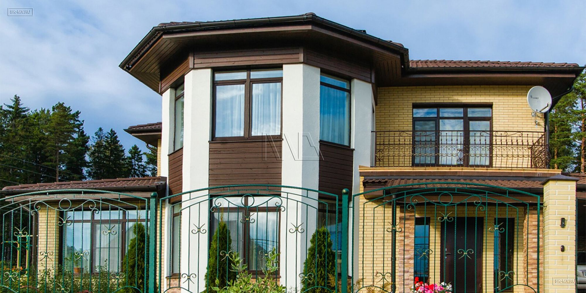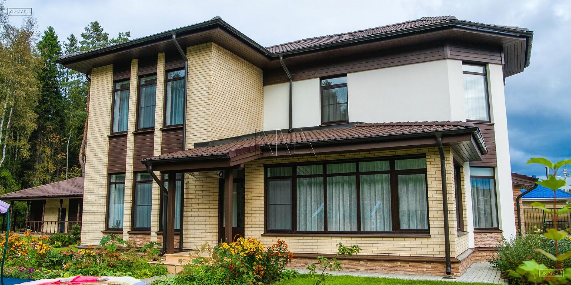 Дом имеет два полноценных жилых этажа без мансарды. Сложный кровельный рисунок и комбинированный фасад создают необычное впечатление от этого дома. Для фасадной отделки использован желтый лицевой кирпич и отделочный камень, коричневая отделочная доска и белая силикатная штукатурка.