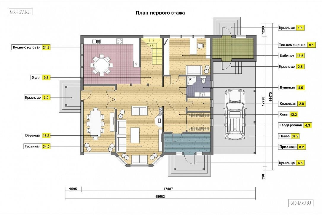 У данного проекта очень рациональная планировка. Рядом с навесом для автомобиля располагается парадный вход. И мы попадаем в большую гостиную. Эркер с максимальным остеклением пропускает солнечный свет в гостиную с утра до вечера. Кухня в доме выделена в отдельную зону, что для многих домовладельцев предпочтительнее с точки зрения мебелировки.