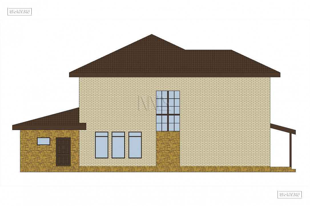 Проект газобетонного дома площадью почти 300 кв.м с навесом для автомобиля и застекленной верандой.