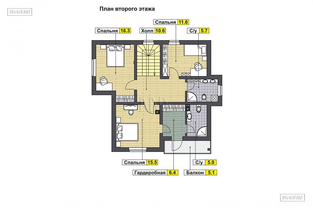 Асимметричный фасад, сложенный из нескольких эркеров, внутренне расширяющих пространство дома, опирается на мощные конструктивные опоры, собирается в единую гармоничную конструкцию очень легкими ограждениями открытых площадок из белого воздушного планкена. На рациональность и практичность планировочных решений домов, построенных в скандинавском стиле, также следует обратить внимание. Во-первых, за счет эркера в доме есть достаточно просторная столовая. Во-вторых, архитектор очень грамотно разнес в противоположные углы здания шумную гостиную и гостевую спальню на первом этаже. В-третьих, на втором этаже для родителей создана мастер-спальня с обособленной ванной комнатой и гардеробной и с выходом на просторный балкон. Мастер-спальня — это личная зона взрослых, можно сказать, это современный подход к организации личного пространства семьи