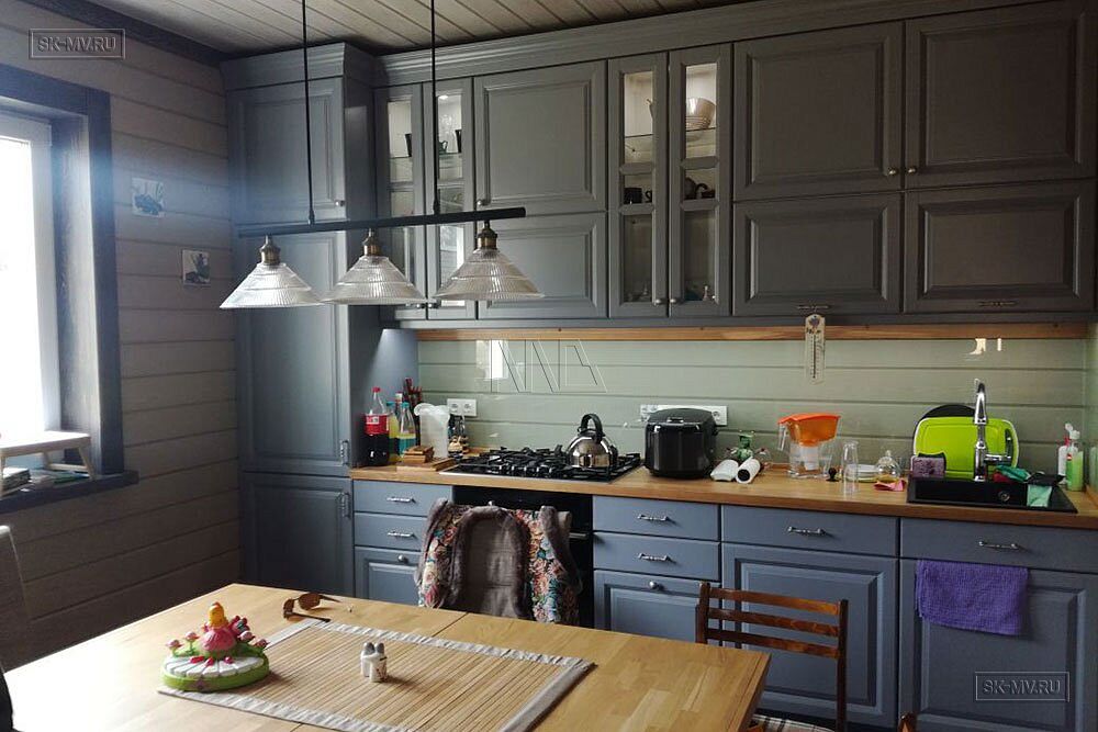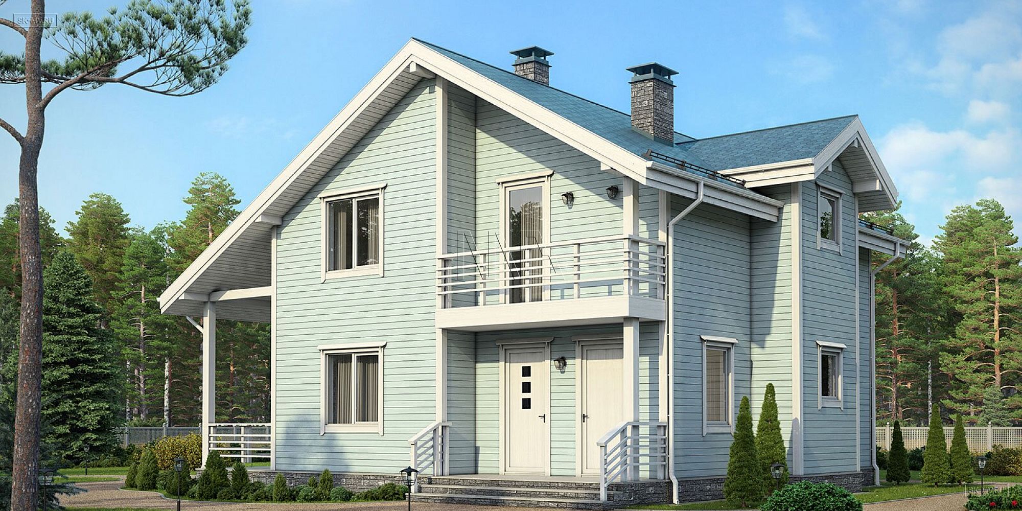Перед нами холодный нордический голубой фасад из натурально дерева — сосны или лиственницы. Фасадная отделка лаконичная и сдержанная, никаких лишних элементов декора, планок, реек.