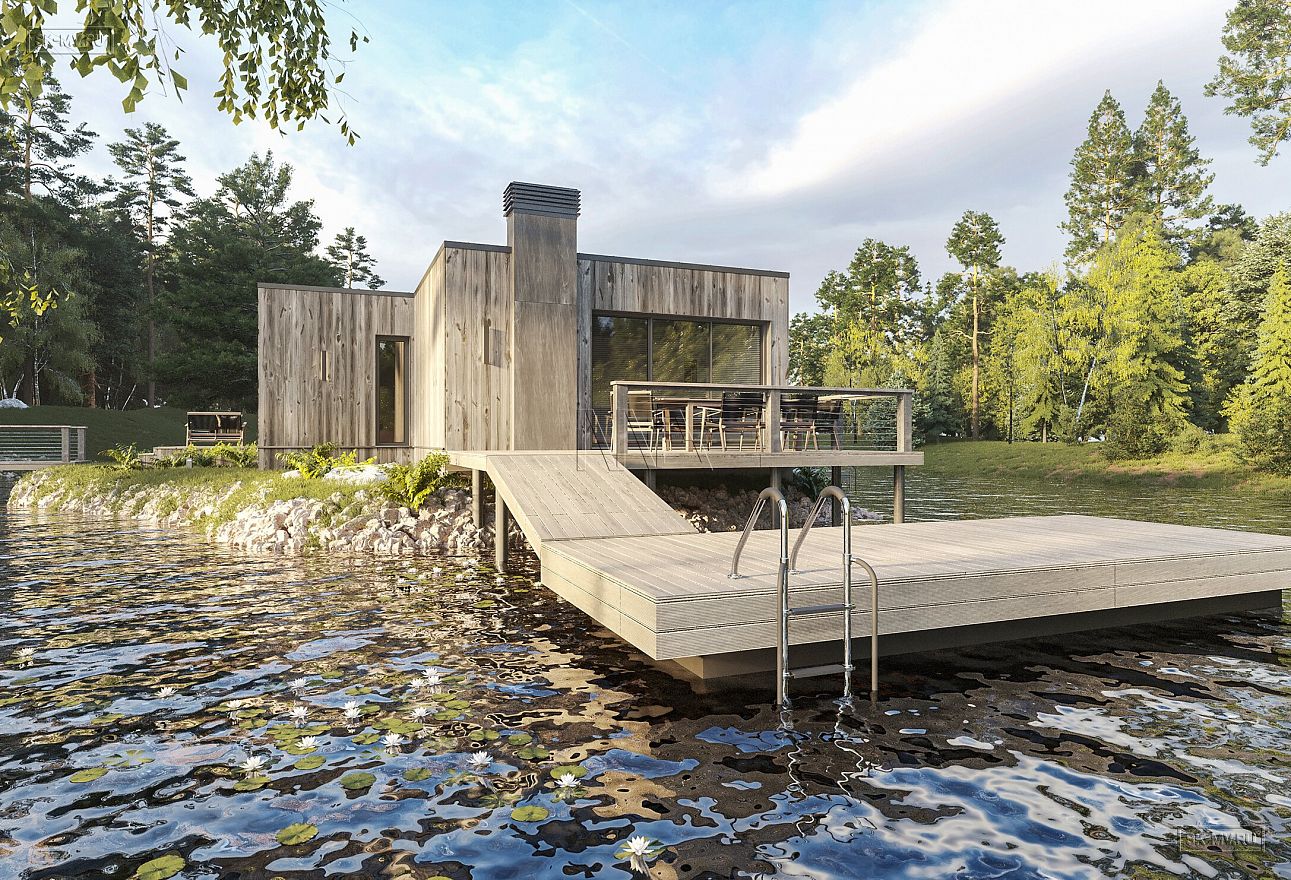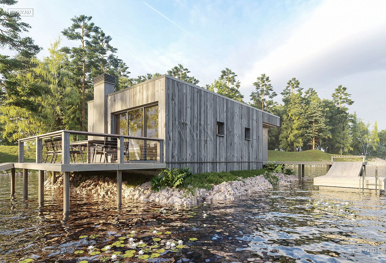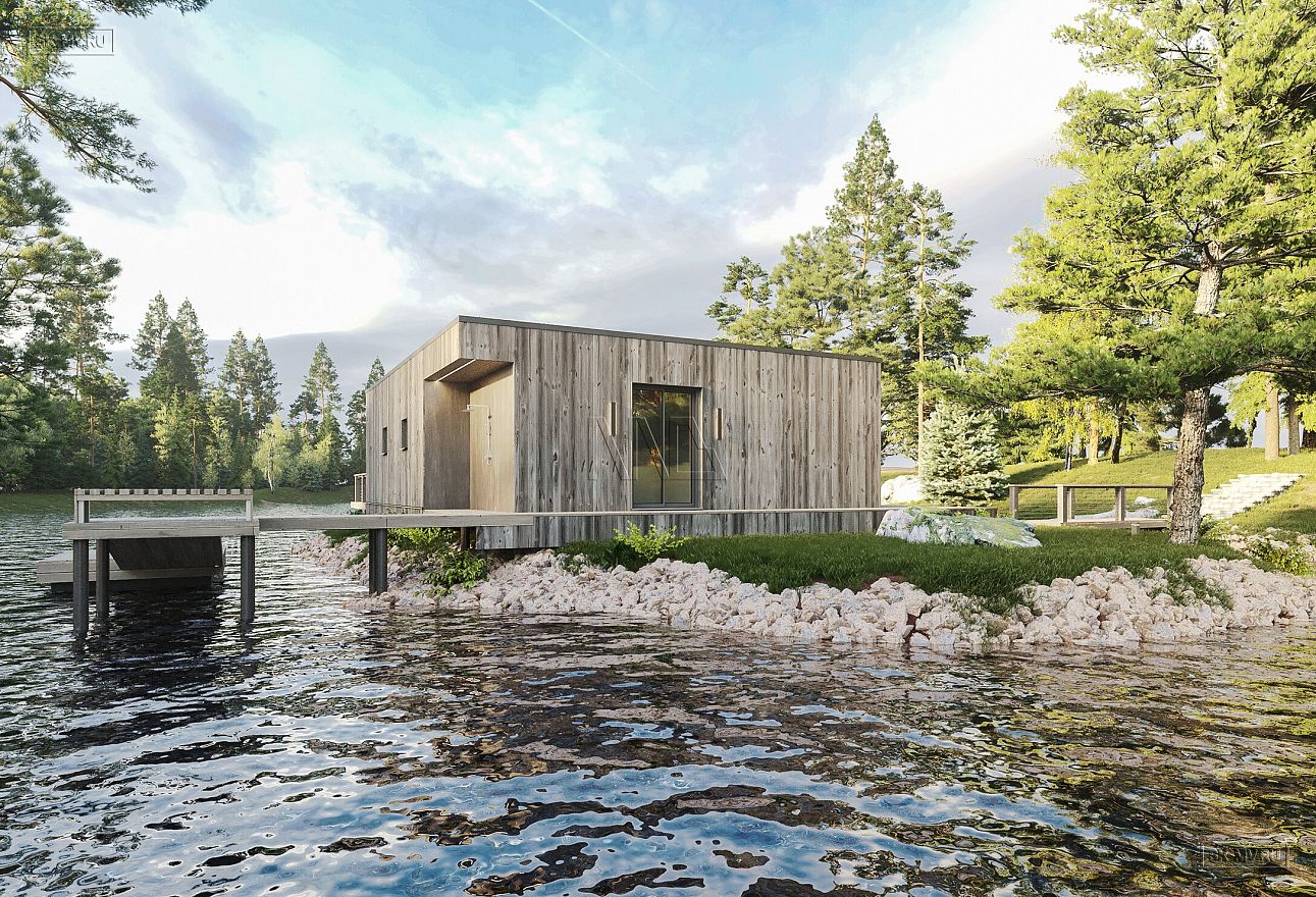 Банный комплекс площадью 77,58 кв.м в стиле барнхаус с плоской кровлей на берегу р. Вуокса — удивительное сочетание архитектурного мастерства и окружающего природного ландшафта.