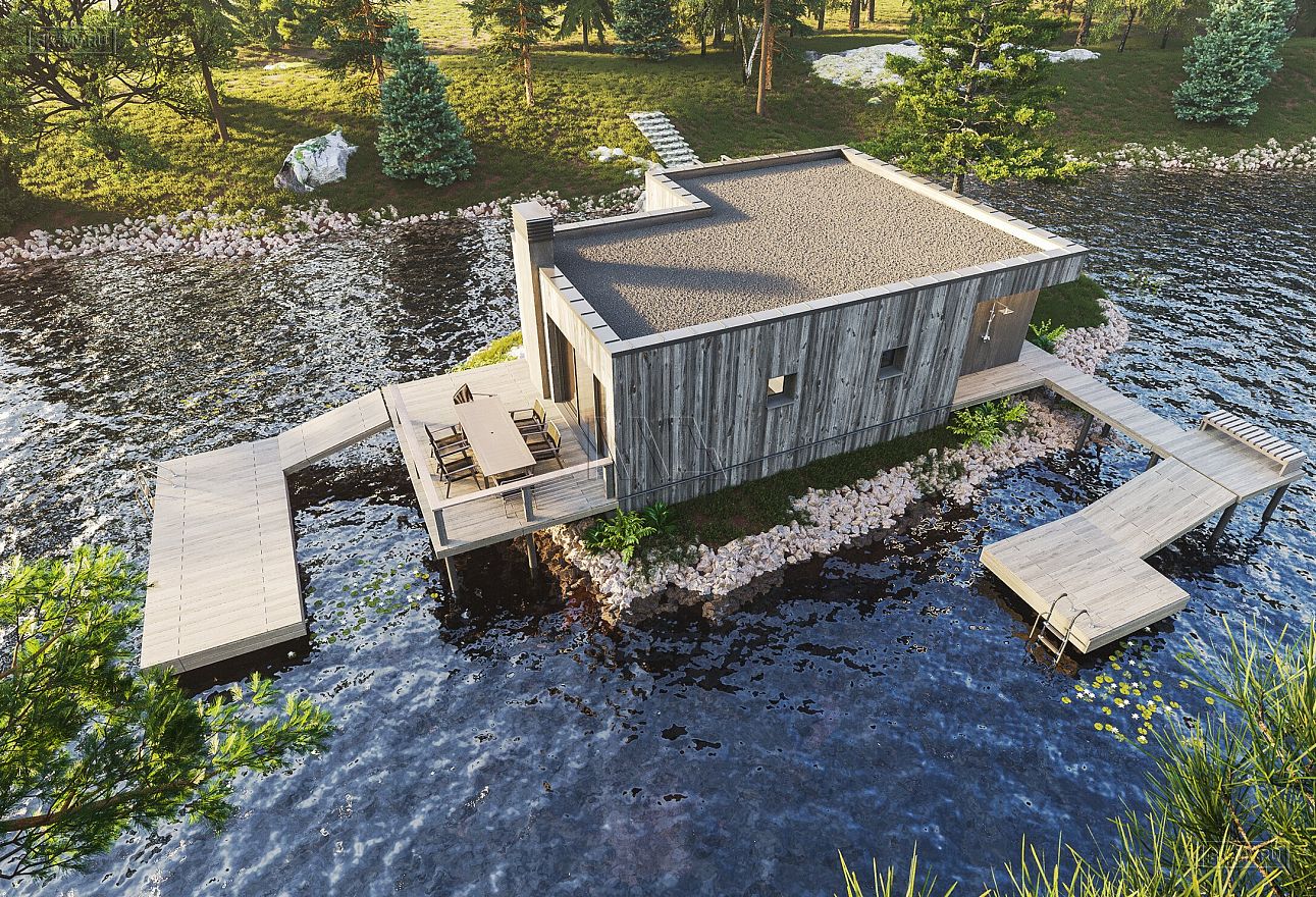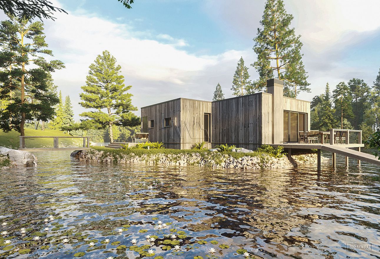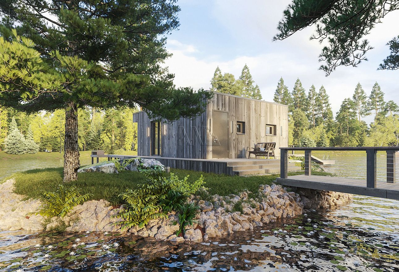 Банный комплекс площадью 77,58 кв.м в стиле барнхаус с плоской кровлей на берегу р. Вуокса — удивительное сочетание архитектурного мастерства и окружающего природного ландшафта.