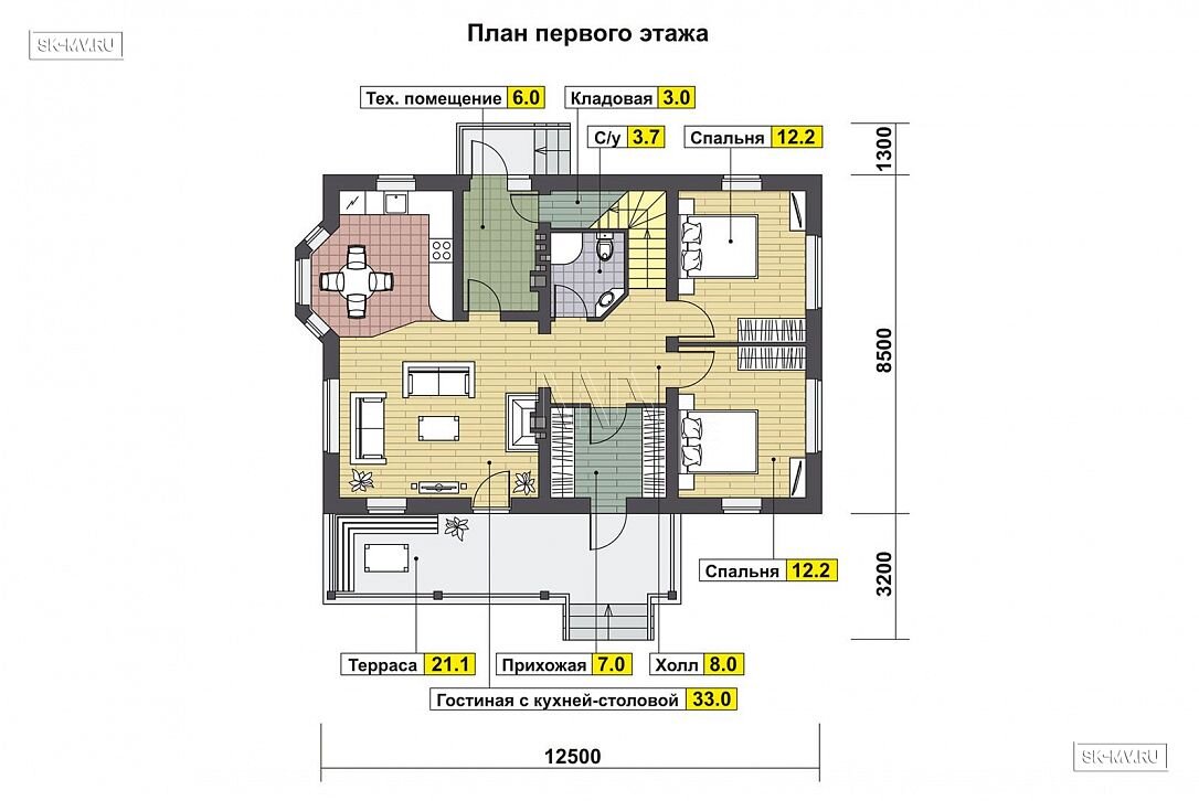 В-седьмых, прямоугольная форма каменного дома позволила разместить на первом этаже две гостевые спальни.