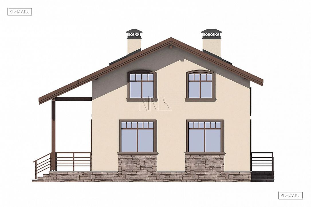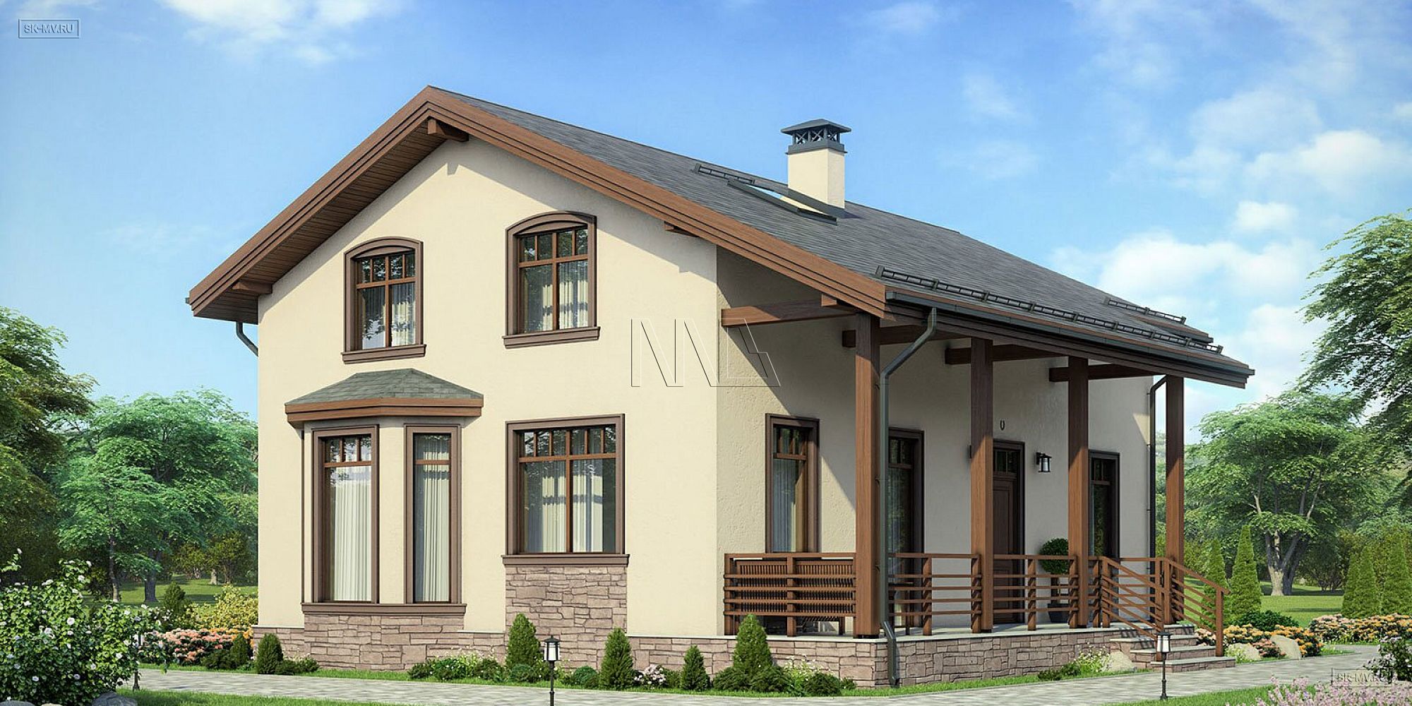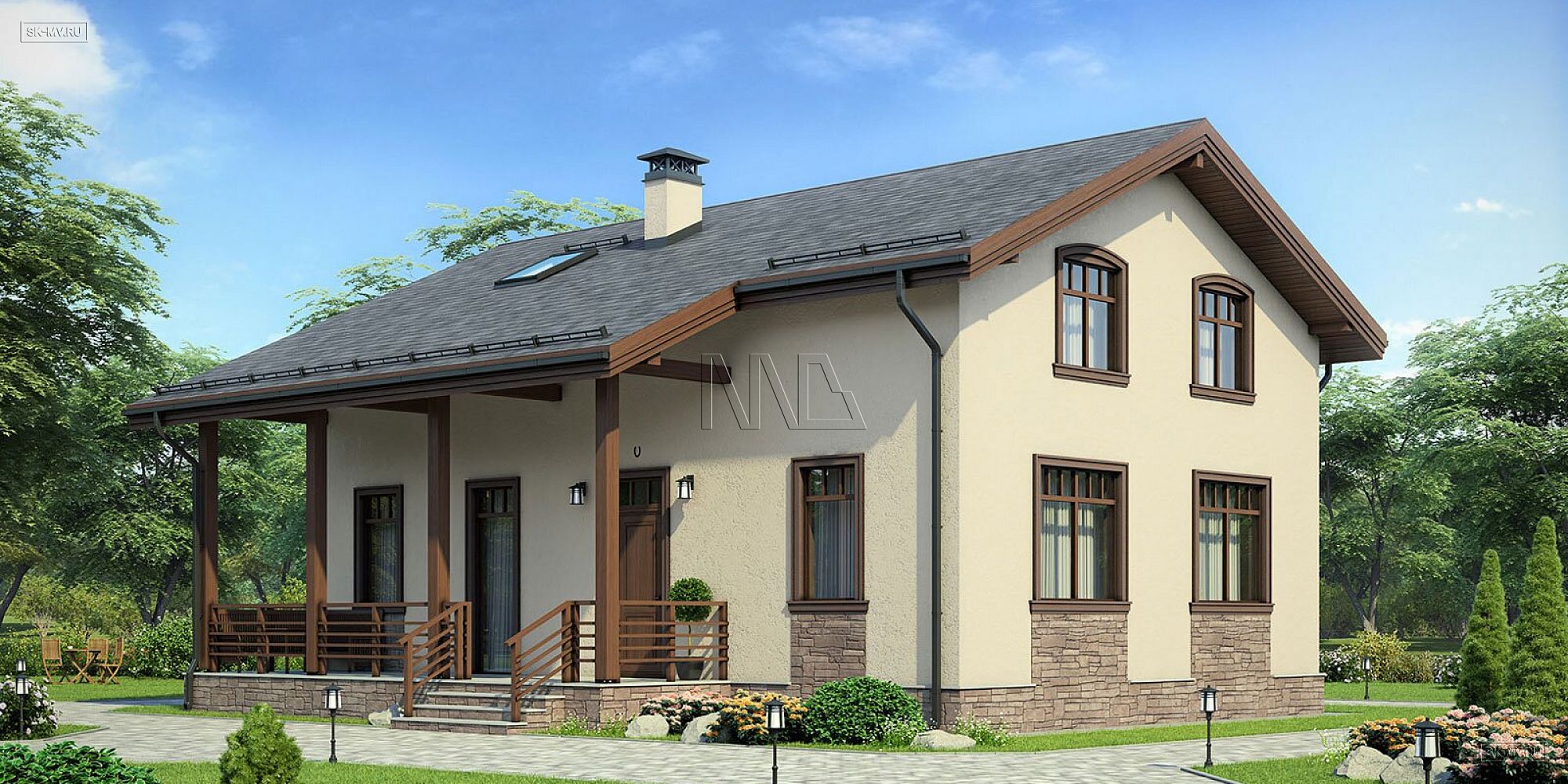 В-пятых, стоит отметить фасадную отделку. Нежная штукатурка на стенах газобетонного / кирпичного дома декорирована коричневыми элементами, наличниками, планками подшивки свесов, стойками и балясинами ограждения террасы. Композицию дополняет использование в фасадной отделке пестрого цокольного камня.