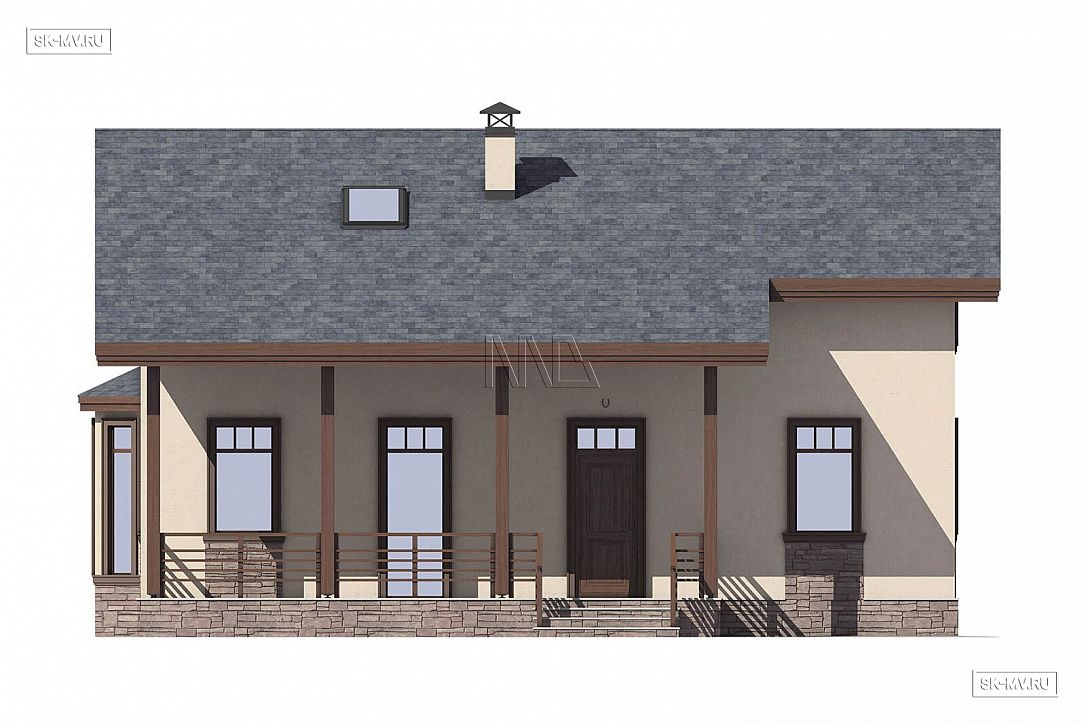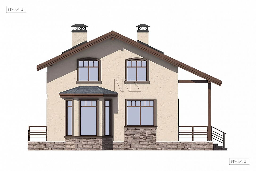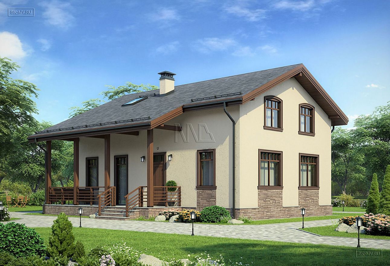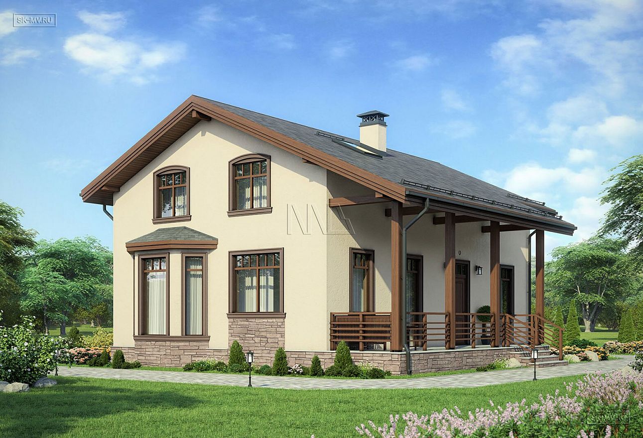 В-пятых, стоит отметить фасадную отделку. Нежная штукатурка на стенах газобетонного / кирпичного дома декорирована коричневыми элементами, наличниками, планками подшивки свесов, стойками и балясинами ограждения террасы. Композицию дополняет использование в фасадной отделке пестрого цокольного камня.