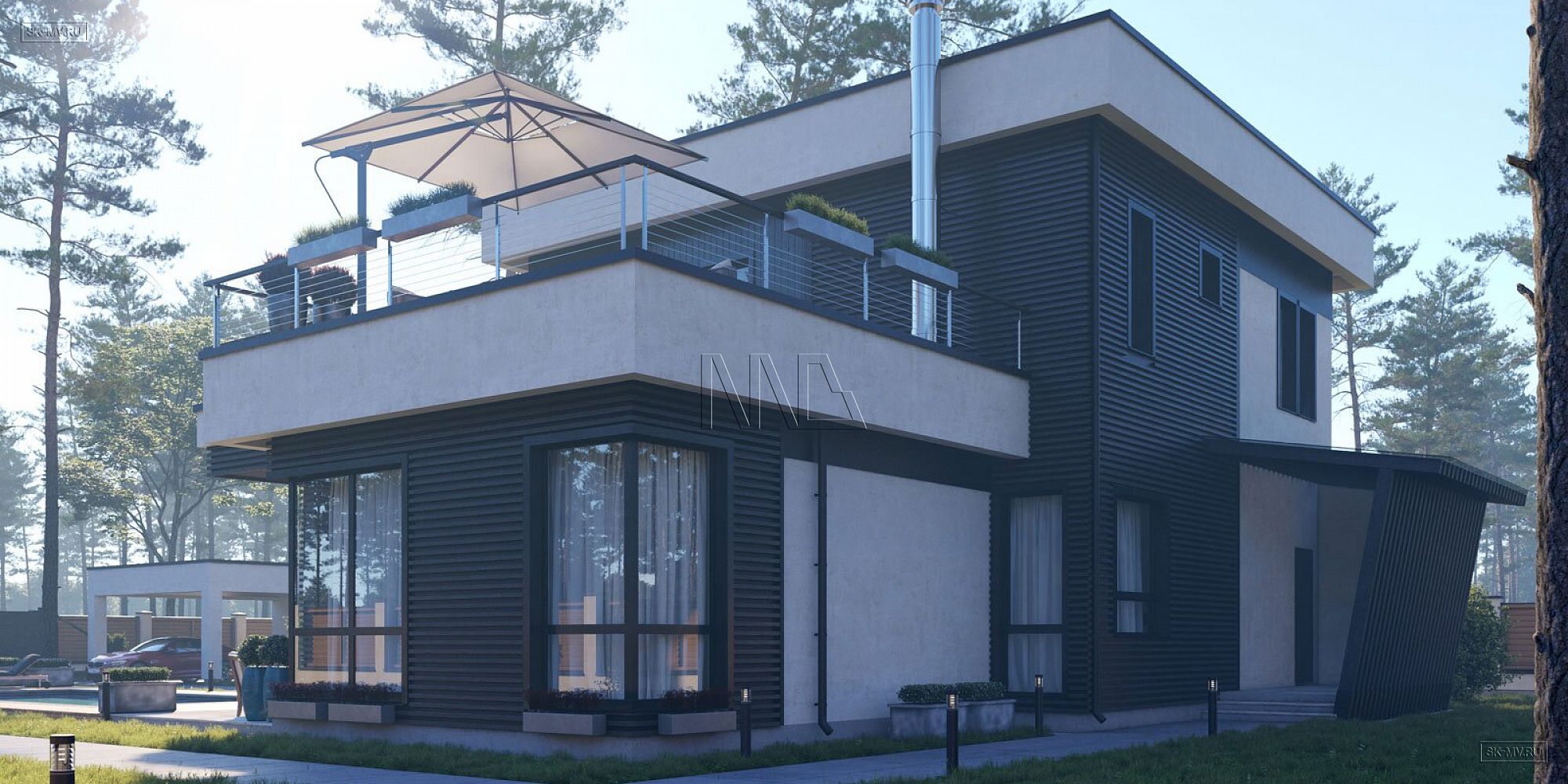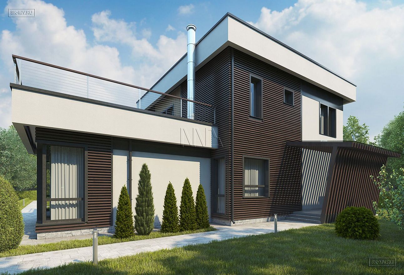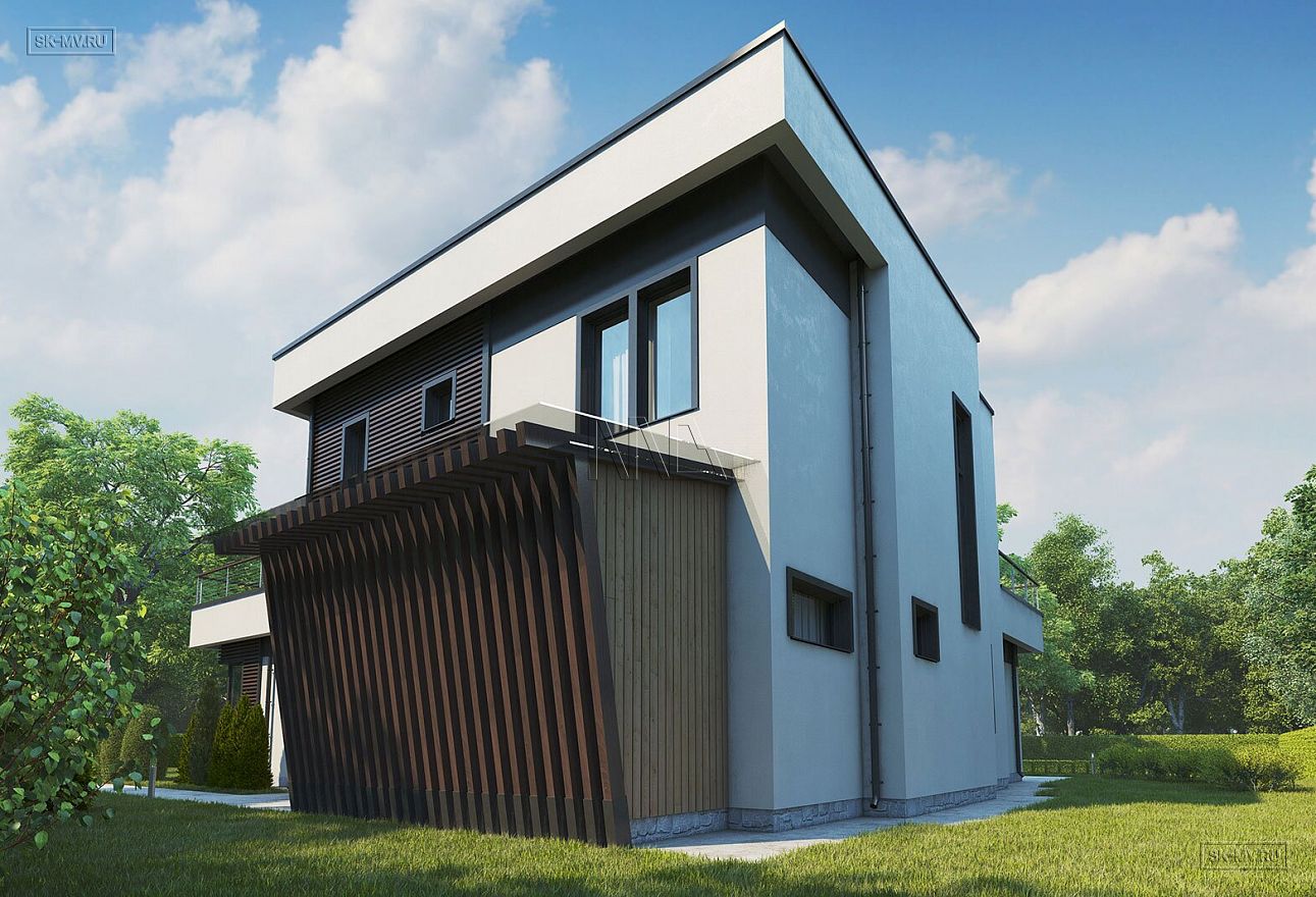 Проект современного дома с плоской крышей «Зеленогорск» площадью чуть более 300 кв.м. — новое концептуальное решение в стиле хай тек от наших архитекторов.