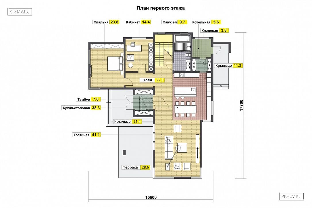 Итак. План первого этажа объединяет светлую внушительных размеров объединенную с кухней-столовой гостиную зону с панорамными окнами и выходом на террасу, рабочий кабинет и просторную спальню для бабушки. А на втором этаже расположились две детские и большая мастер-спальня с гардеробной и собственной ванной комнатой с окном — личное пространство родителей.