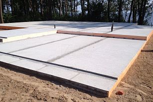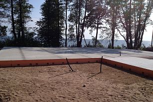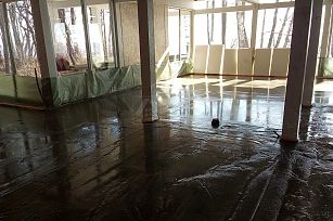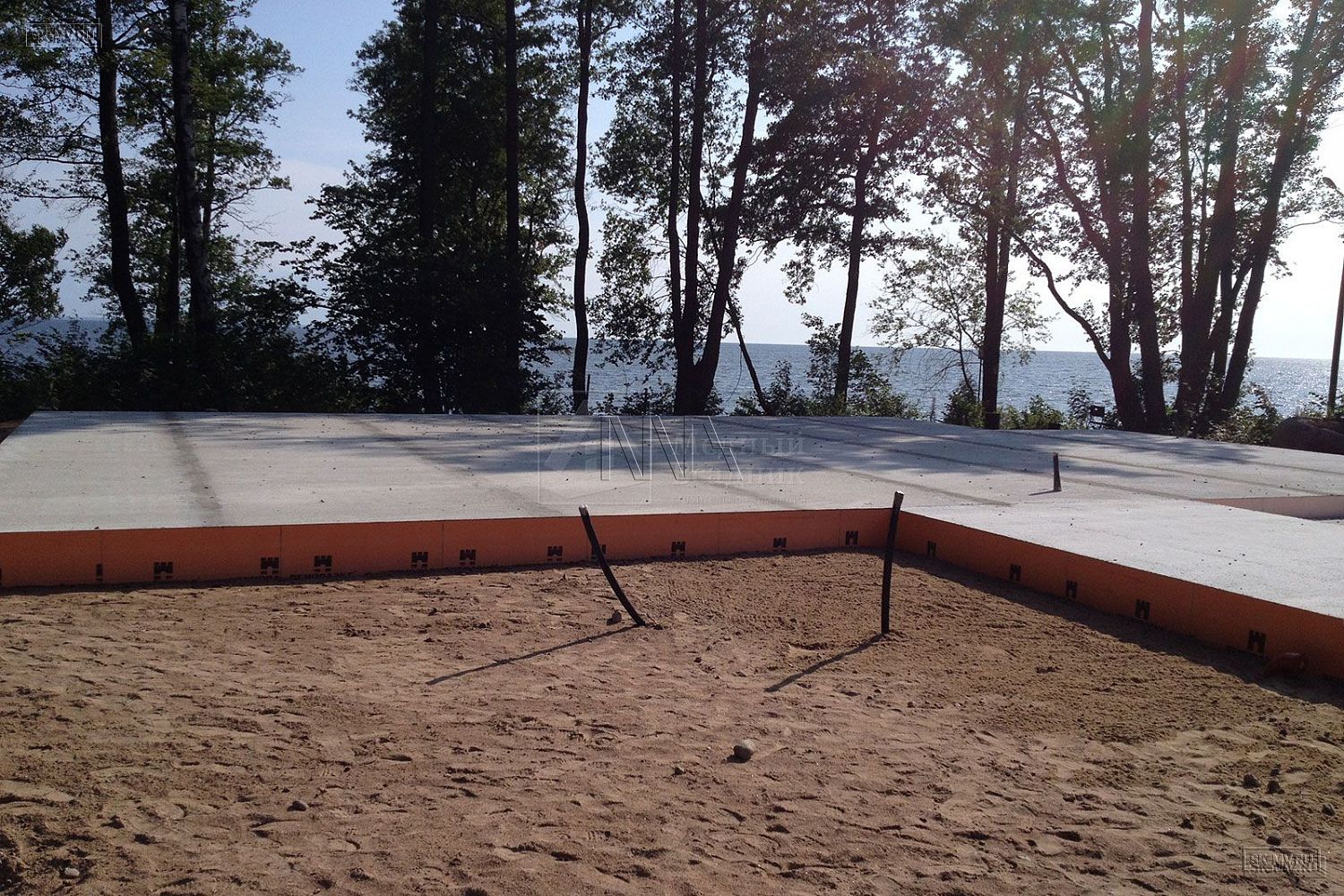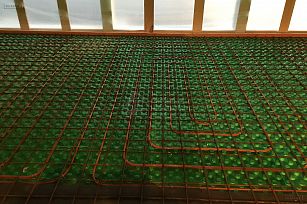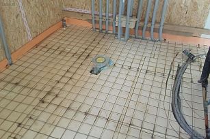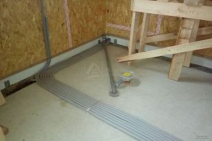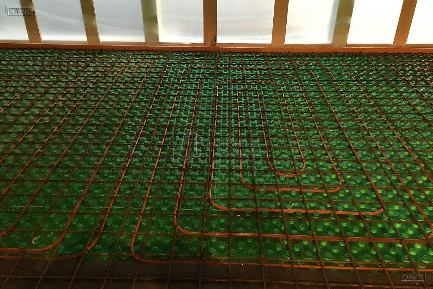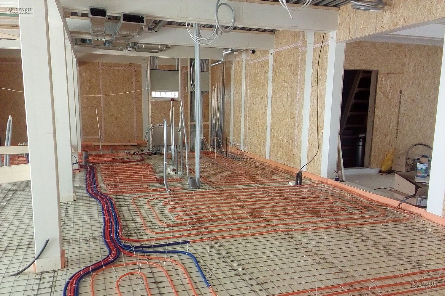 Разводка инженерных коммуникаций (вода, канализация, электроснабжение и отопление) в полу первого этажа с устройством стяжки пола с интегрированной системой жидкостных теплых полов.