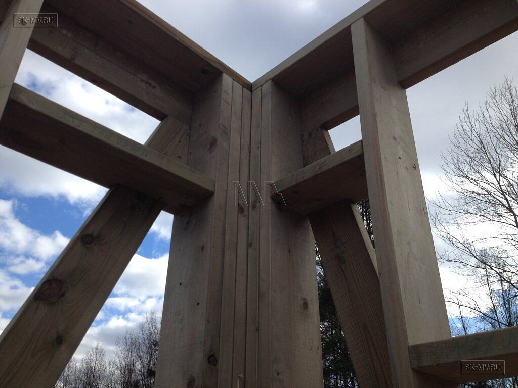 Конструкция каркаса стен подразумевает раскладку утеплителя «сотами». Плиты утеплителя укладываются в распор и перехлест слоев между стойками каркаса с установкой горизонтальных ригелей (появляются «соты») во избежание вертикальной осадки утеплителя по высоте стены. Такая сложная конструкция обеспечивает высокие теплоизоляционные показатели каркасного дома на долгие годы.